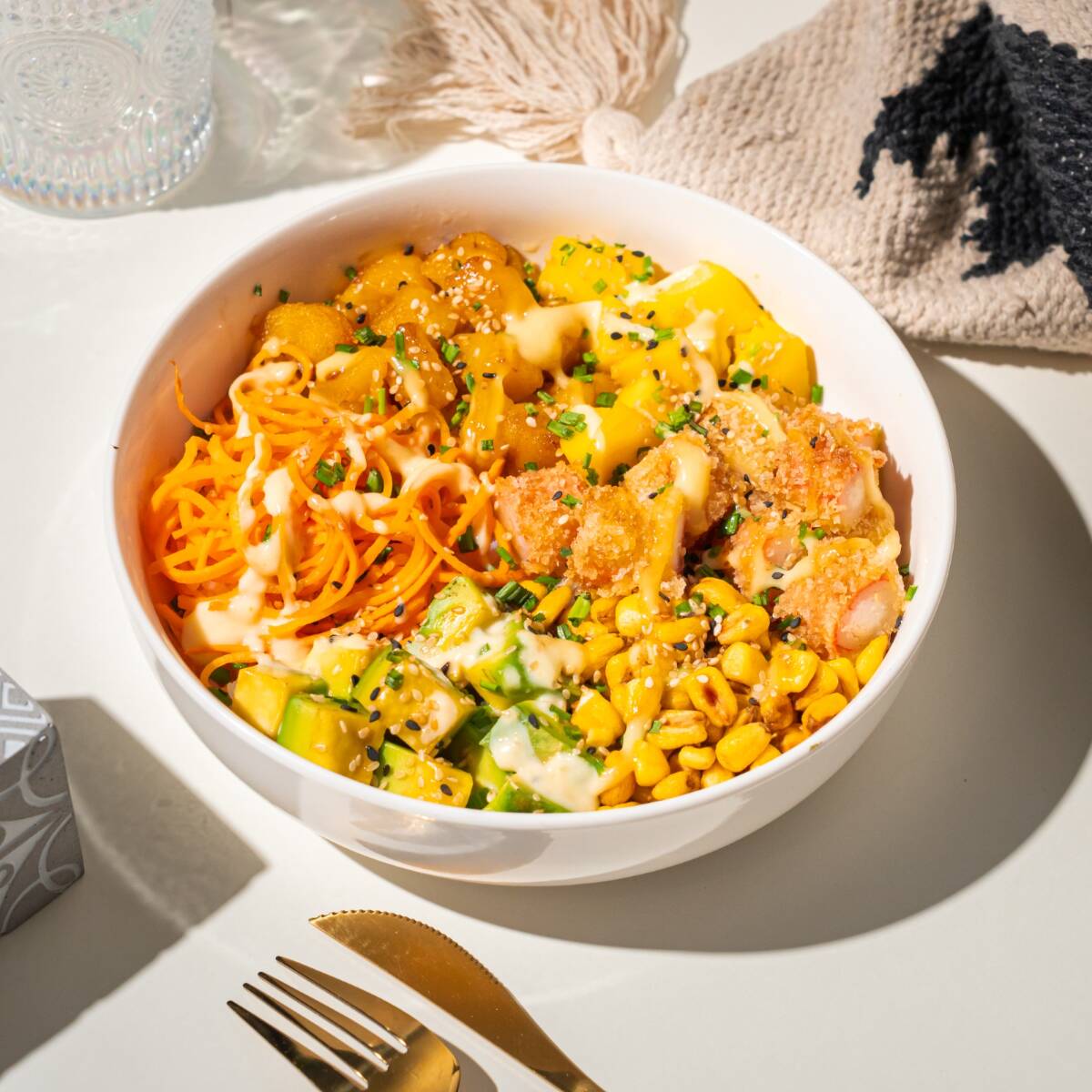 Poke bowl con arroz de sushi con palmito de cangrejo tempura, maíz tostado, aguacate, plátano maduro, mango, zanahoria, salsa, ajonjolí y cebollín.