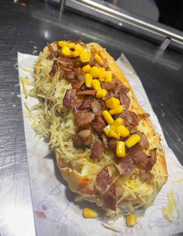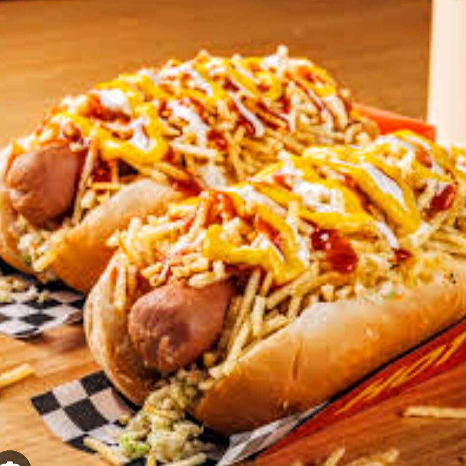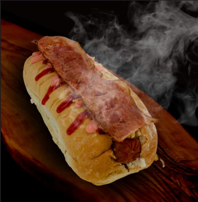 Salchicha americana, jamón, tocineta, pan artesanal, queso fundido, salsa especial de la casa, cebolla caramelizada, lechuga fresca y papa chip