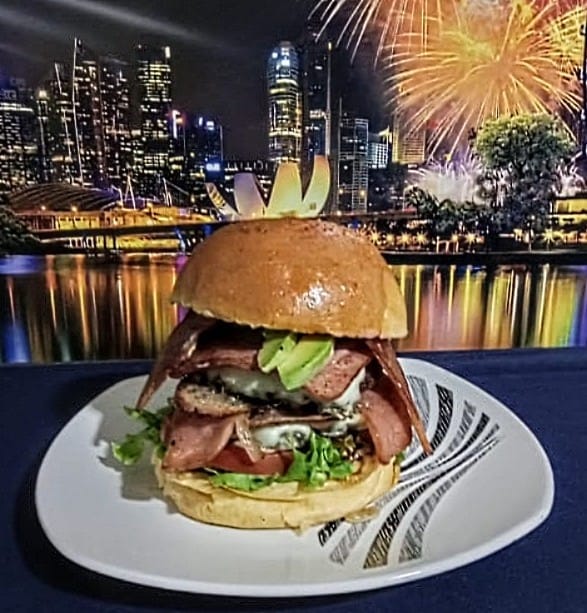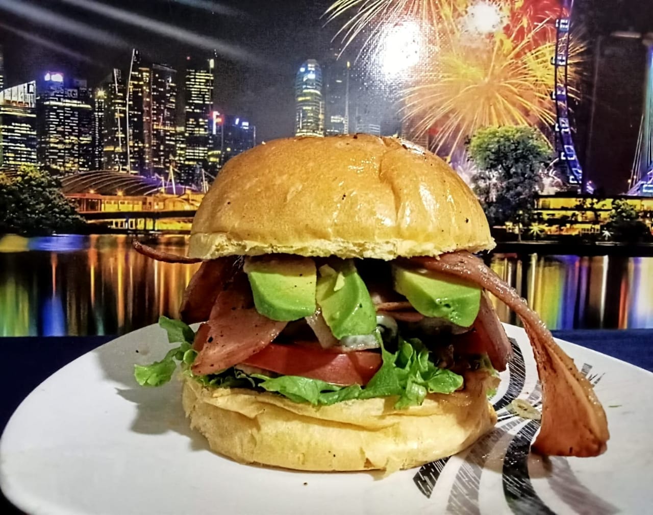 130 gr de filete pechuga a la plancha, pan artesanal a base de papa, queso fundido, jamón de cordero, tocineta, salsa especial de la casa, guacamole, lechuga fresca, cebolla grille y tajadas de tomate