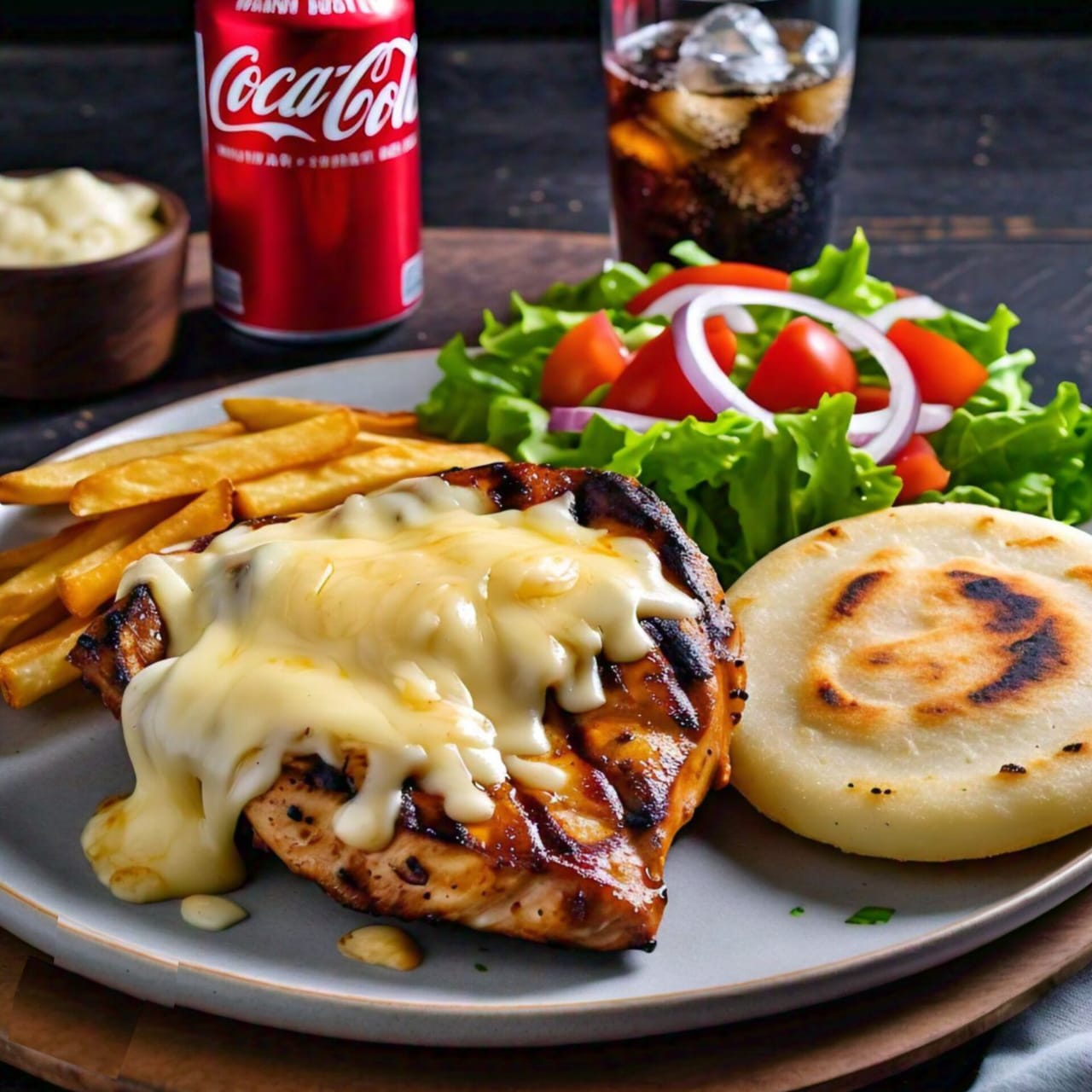 75 gr de queso gratinado, 80 gr de papa a la francesa, arepa blanca frita, ensalada natural (lechuga, tomate y cebolla) + gaseosa 250ml