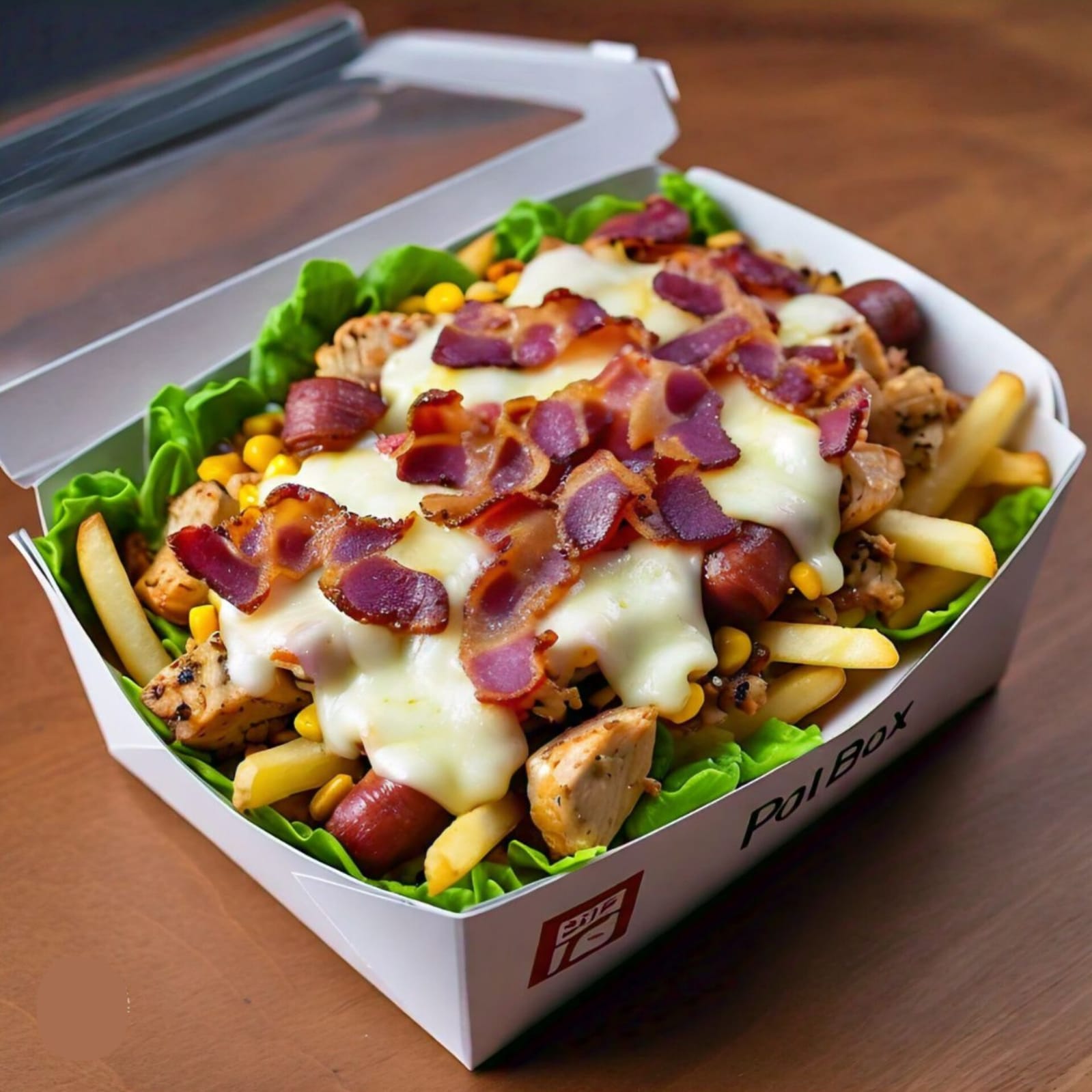 Papá a la francesa, 80 gramos de pollo en cuadritos, salchicha americana, maíz tierno, queso fundido, tocino, salsa especial de la casa, lechuga fresca y papa cabello de angel