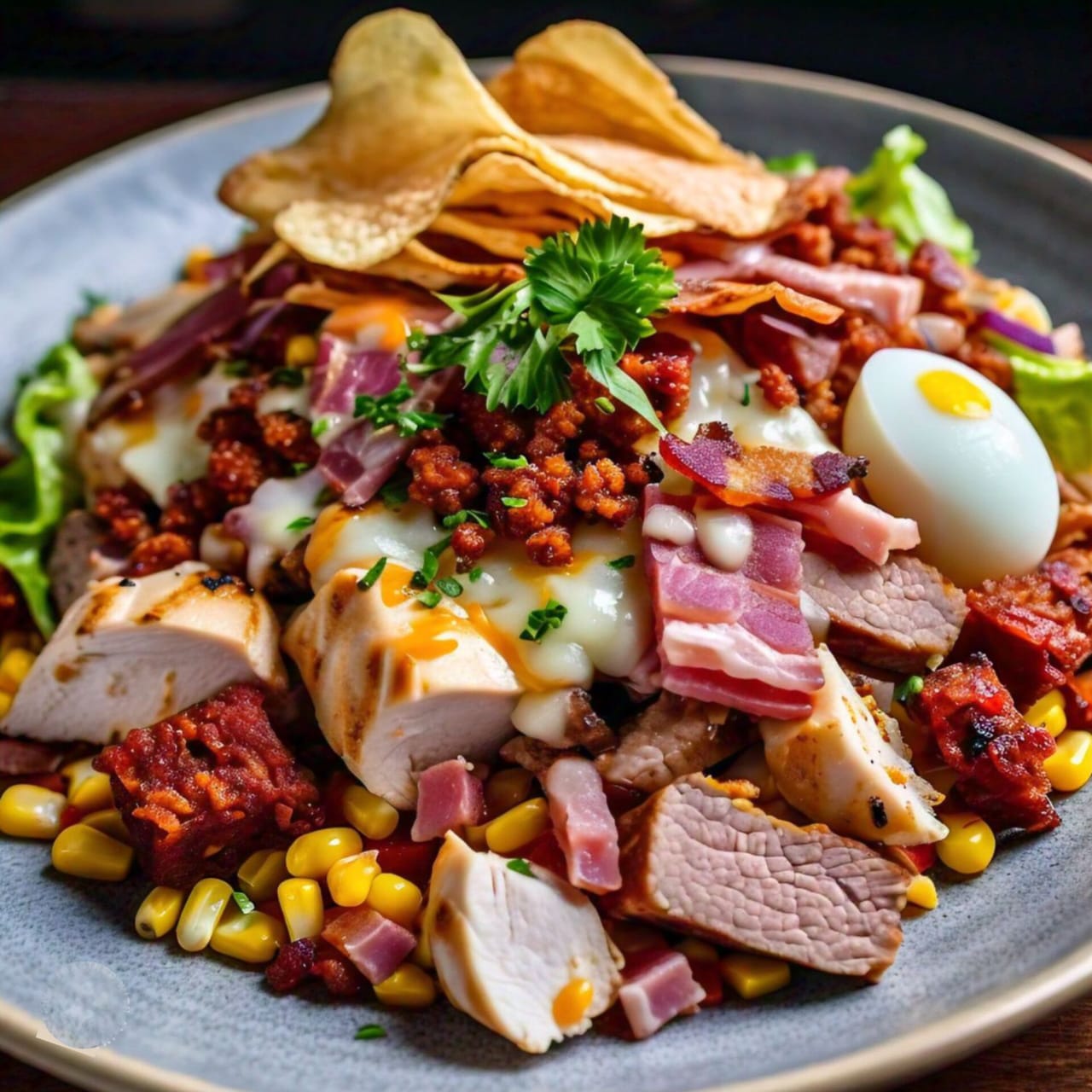 150gr maíz tierno, 100gr pollo en cuadros, 100gr carne artesanal, chorizo, 2 huevos de codorniz, 70gr cabano, jamón en tiras, tocino, queso fundido,salsa especial de la casa, lechuga fresca y papa chip