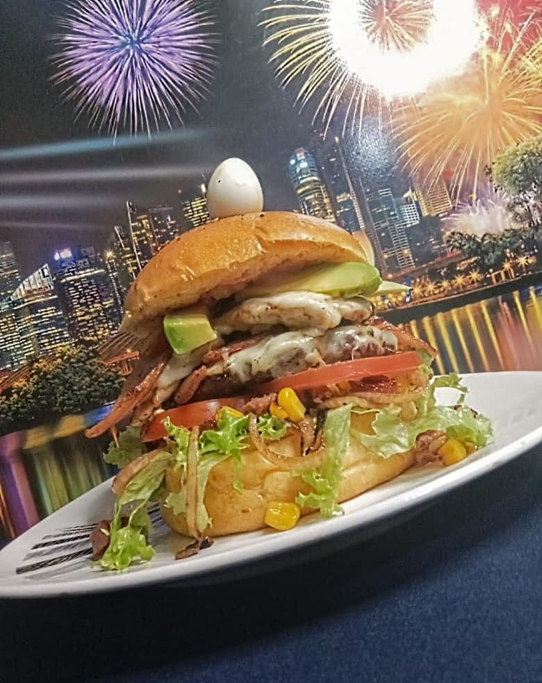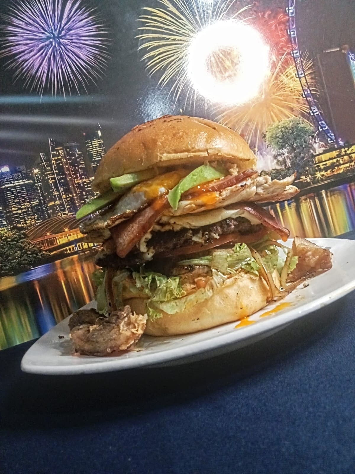 Media libra de carne artesanal, media libra de filete de pechuga, chicharrón carnudo, doble jamón de cordero, pan artesanal a base de papa, doble queso, 1 huevo frito, salsa especial de la casa, guacamole, lechuga fresca, cebolla grille y tajadas de tomate