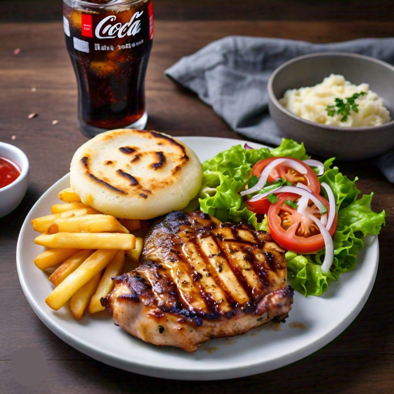 80 gr de papa a la francesa, arepa blanca frita, ensalada natural (lechuga, tomate y cebolla) + gaseosa 250ml
