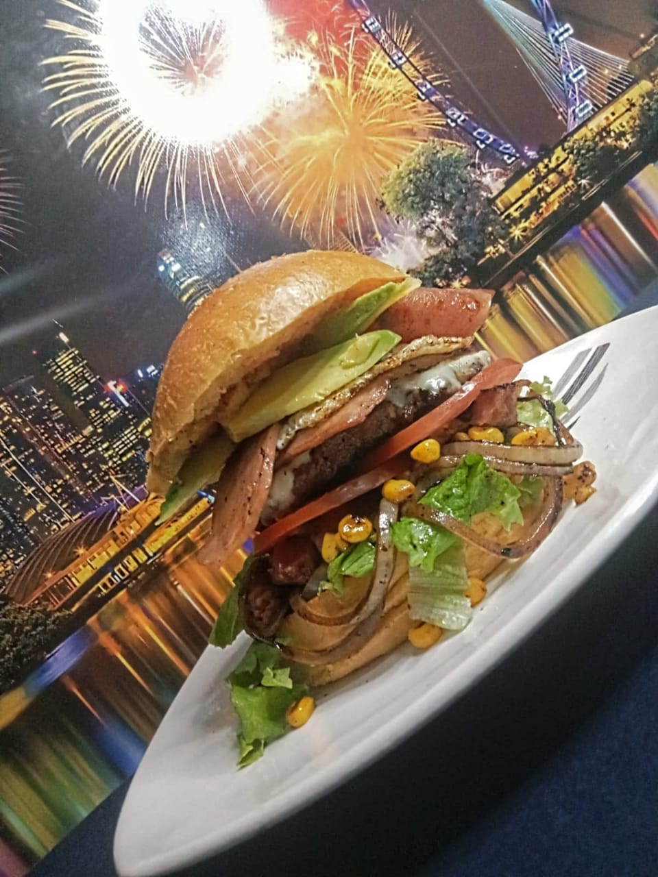 1/4 de libra de carne artesanal, cabano, pan artesanal a base de papa, queso fundido, maíz tierno, huevo frito, jamón de cordero, tocineta, salsa especial de la casa, guacamole, lechuga fresca, cebolla grille y tajadas de tomate