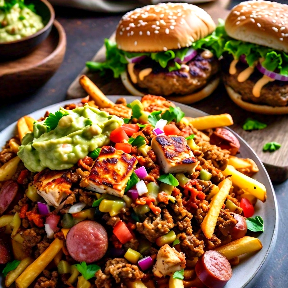 1/4 de libra de carne artesanal, 1/4 de libra de filete de pechuga, chorizo de cerdo, doble jamon de cordero, pan artesanal a base de papa, doble queso fundido, maíz tierno, guacamole, salsa especial de la casa, lechuga fresca, cebolla grille y rodajas de tomate