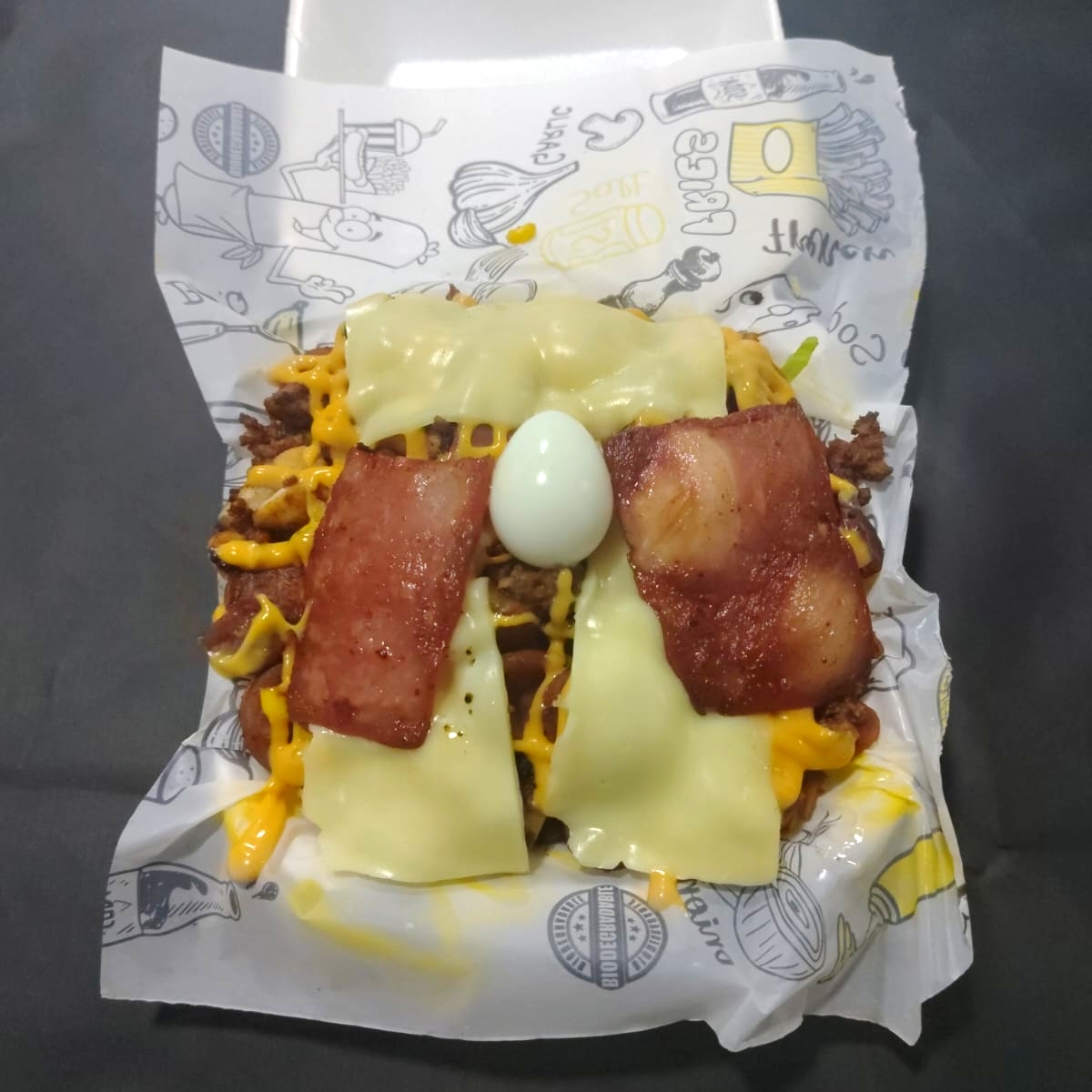 Papá a la francesa, 100 gramos de carne molida, 100 gramos de pollo en cuadritos, salchicha americana, chorizo de cerdo, maíz tierno, 2 huevos de codorniz, doble queso fundido, tocino, guacamole, salsa especial de la casa, lechuga fresca y papa cabello de angel