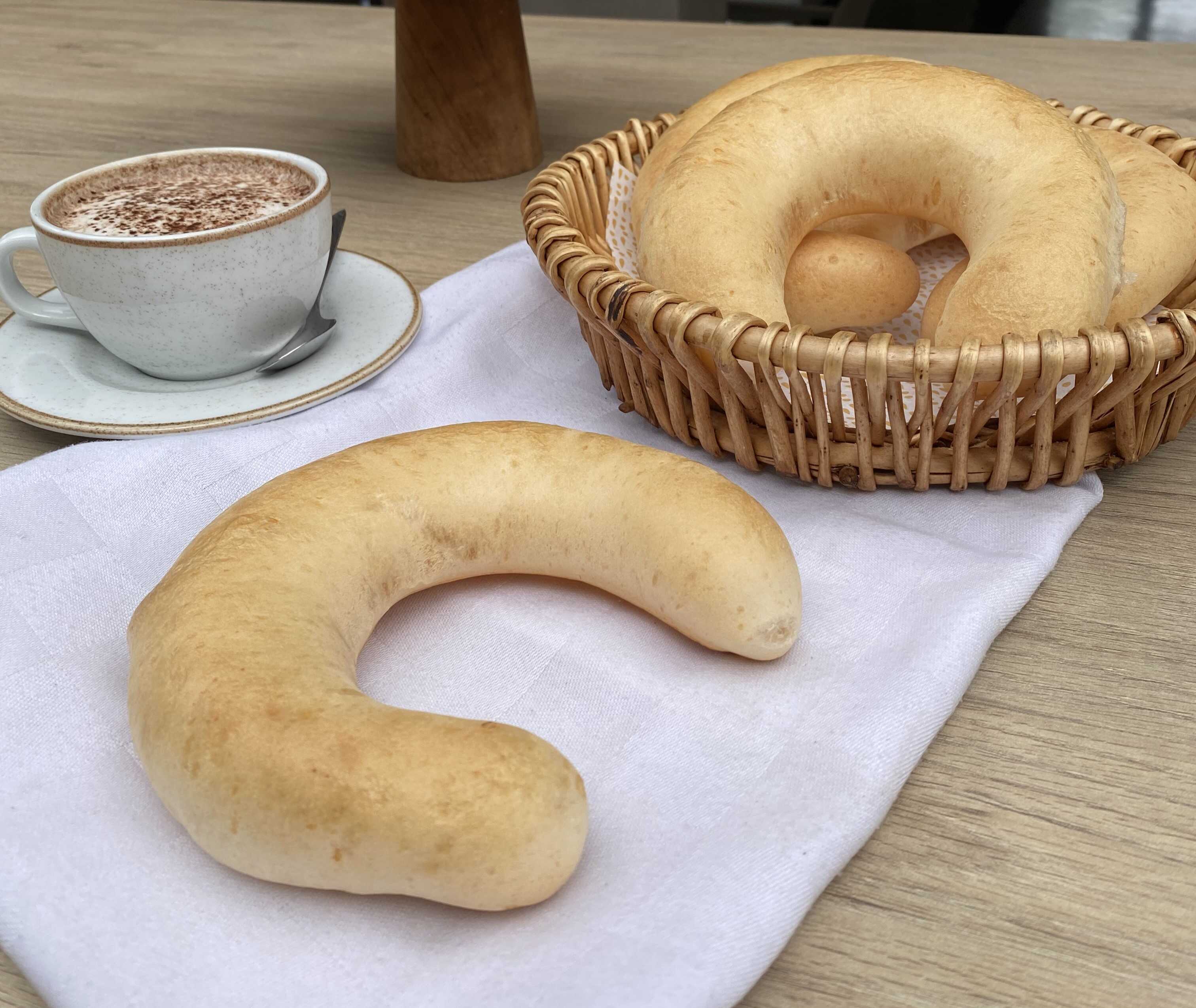 Omelette de champiñón y queso o maíz y jamón, jugo de naranja natural en botella, pan blandito y café o chocolate.
