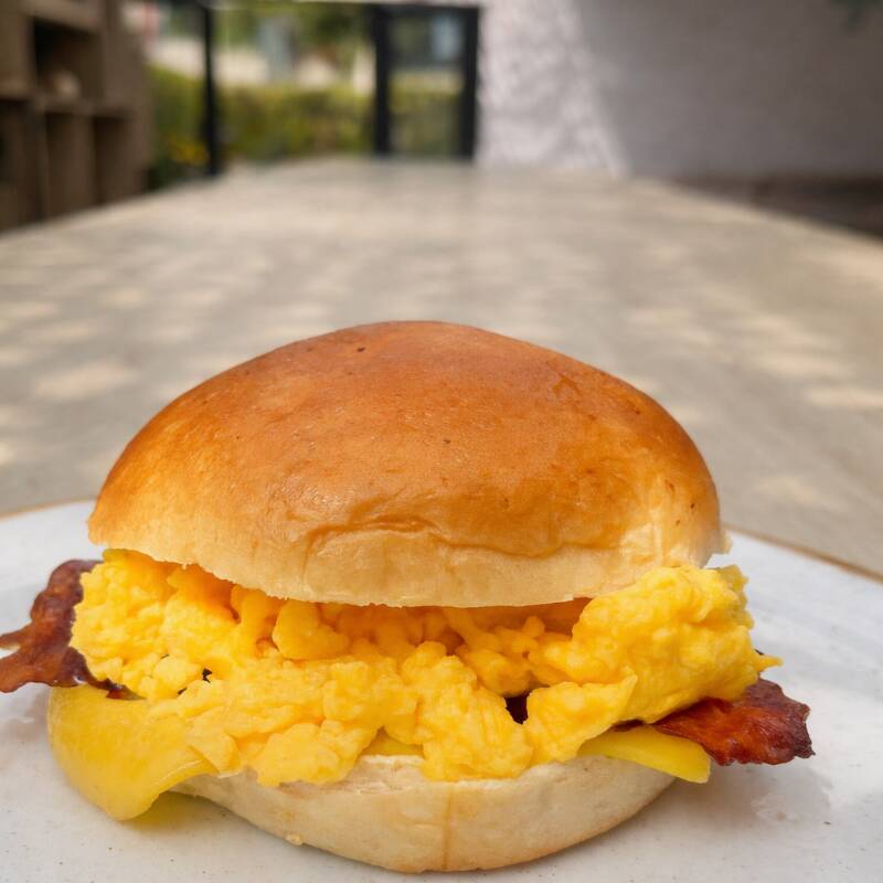Pan blandito, huevos revueltos, queso holandés y tocineta.