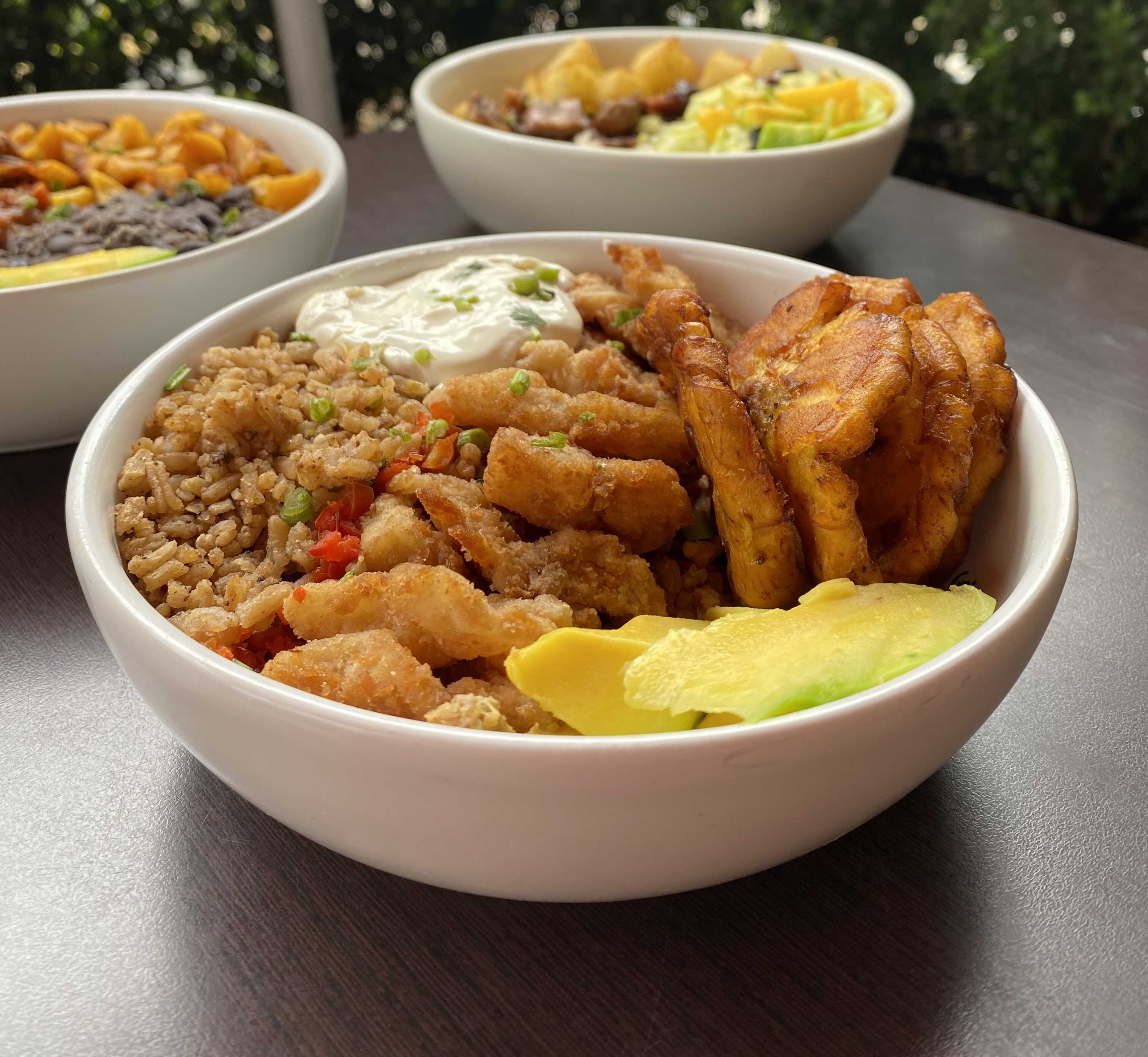 Arroz con coco, tilapia apanada. patacón verde, aguacate y suero costeño.