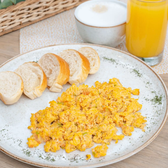Huevos fritos, revueltos, cebolla y tomate, acompañados de pan blandito.
