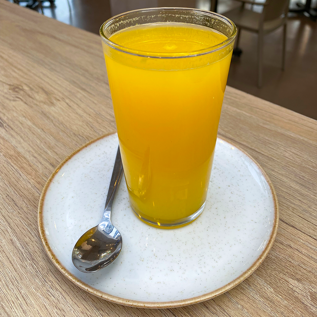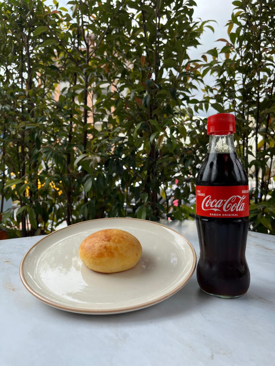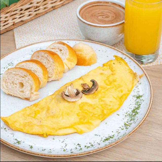 Omelette de champiñón y queso o maíz y jamón, jugo de naranja natural en botella, pan blandito y café o chocolate.
