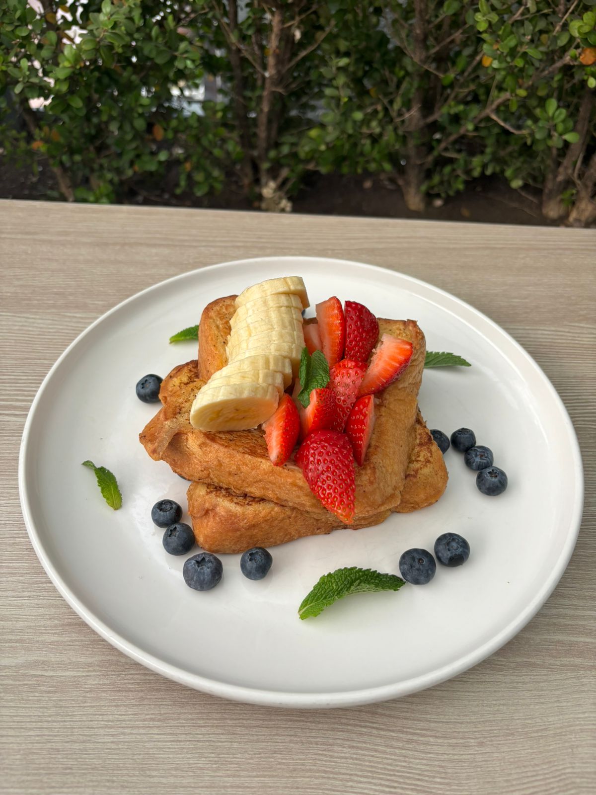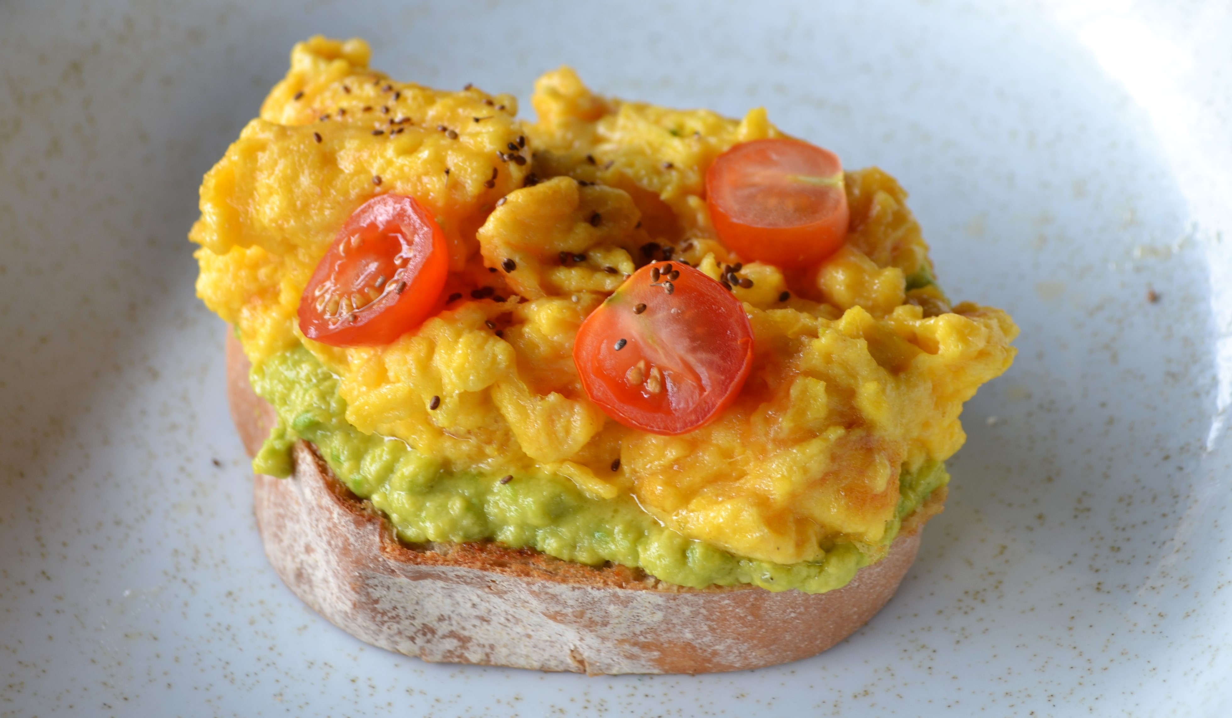 Tostada de pan centeno, puré de aguacate, queso holandés, y huevos revueltos.