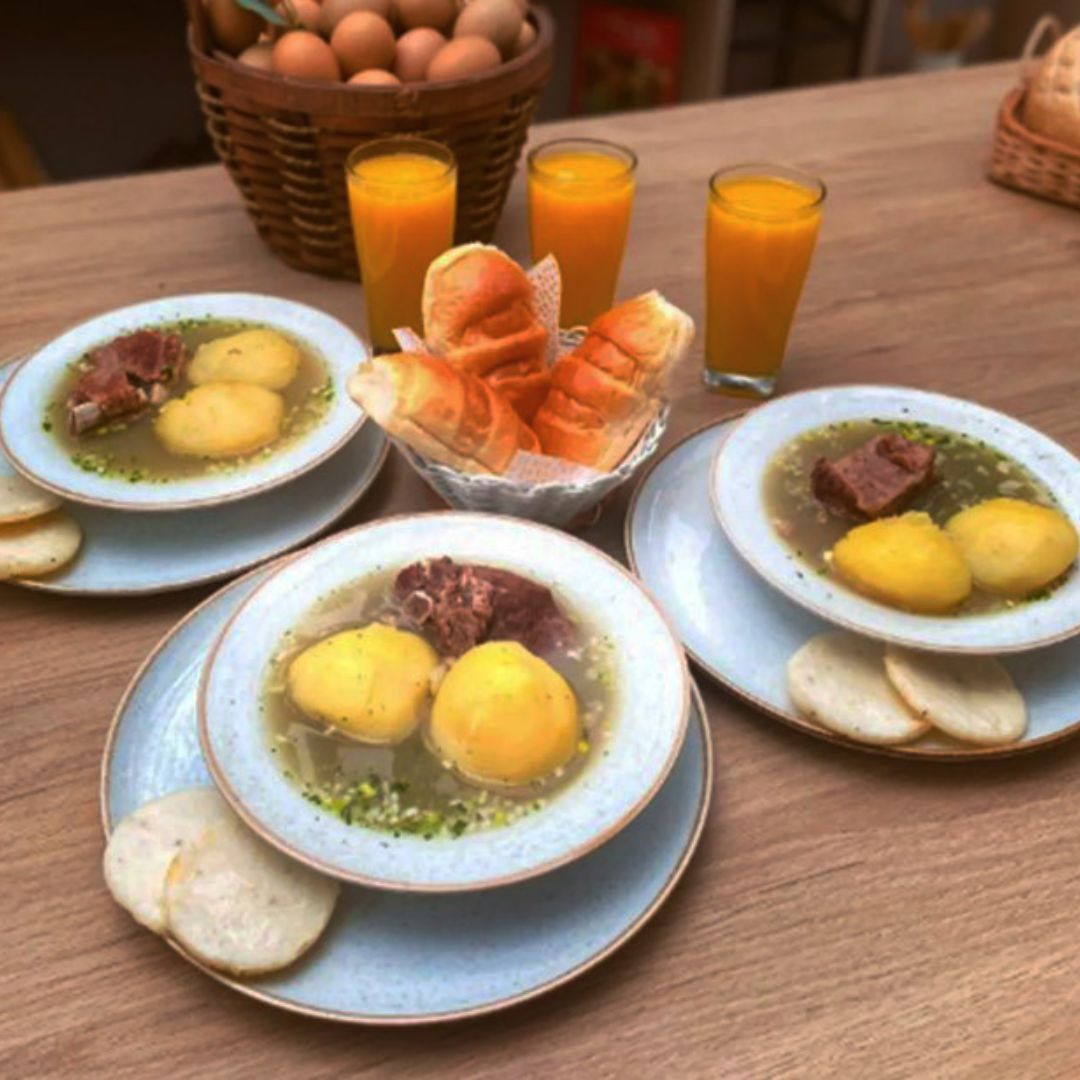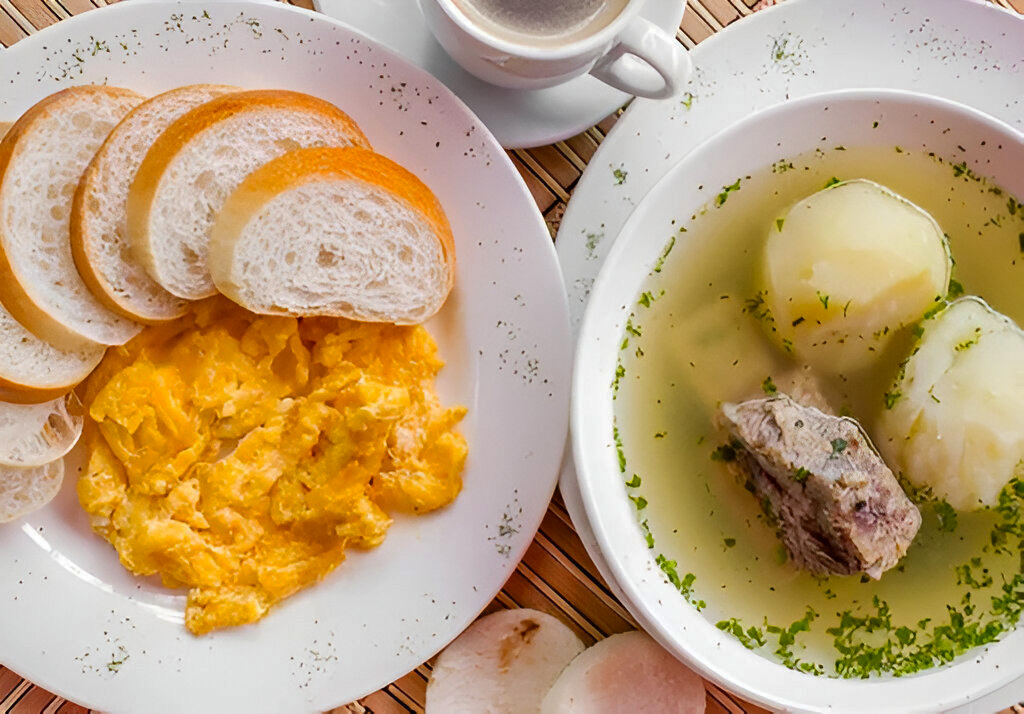 Huevos al gusto, pan blandito, caldo de costilla, café o chocolate.