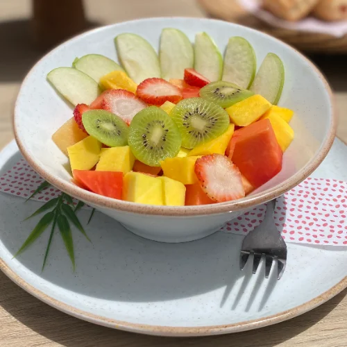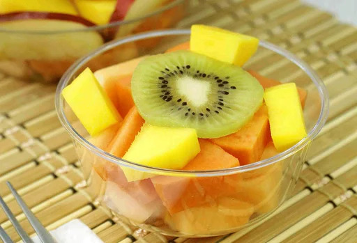 Ensalada con fresa, kiwi, mango, manzana, melón y papaya.