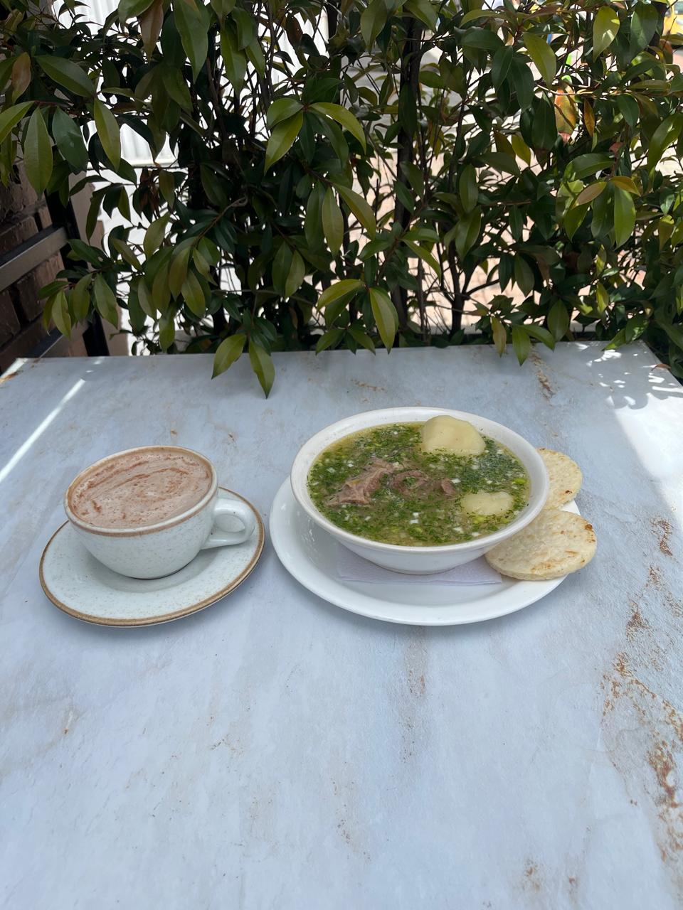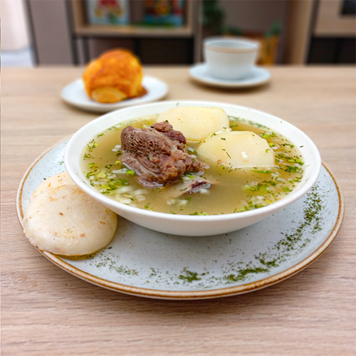 Caldo con 160 g de asado de tira, acompañado de dos arepas.