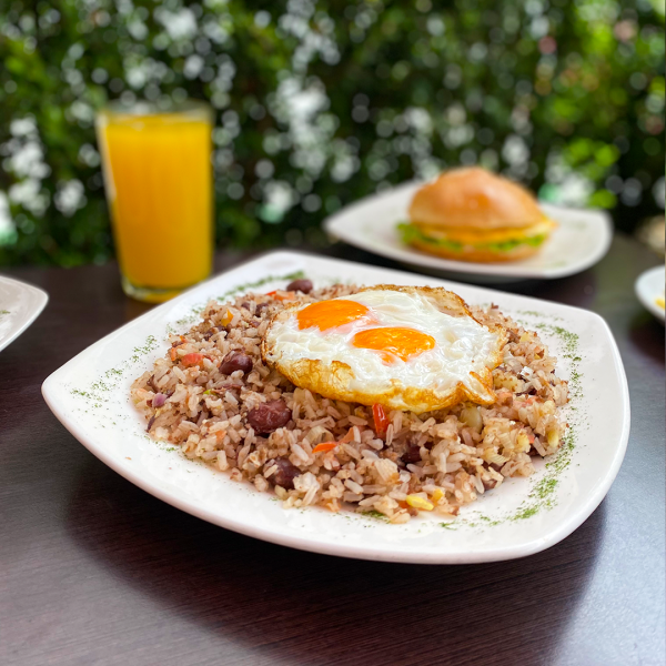 Huevos fritos revueltos o pericos, café o chocolate 6 oz y jugo natural de naranja en botella.