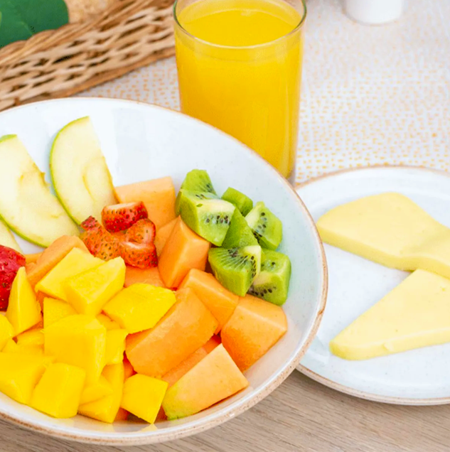 Saludable de fruta mixta, jugo naranja natural en botella y porción de queso.
