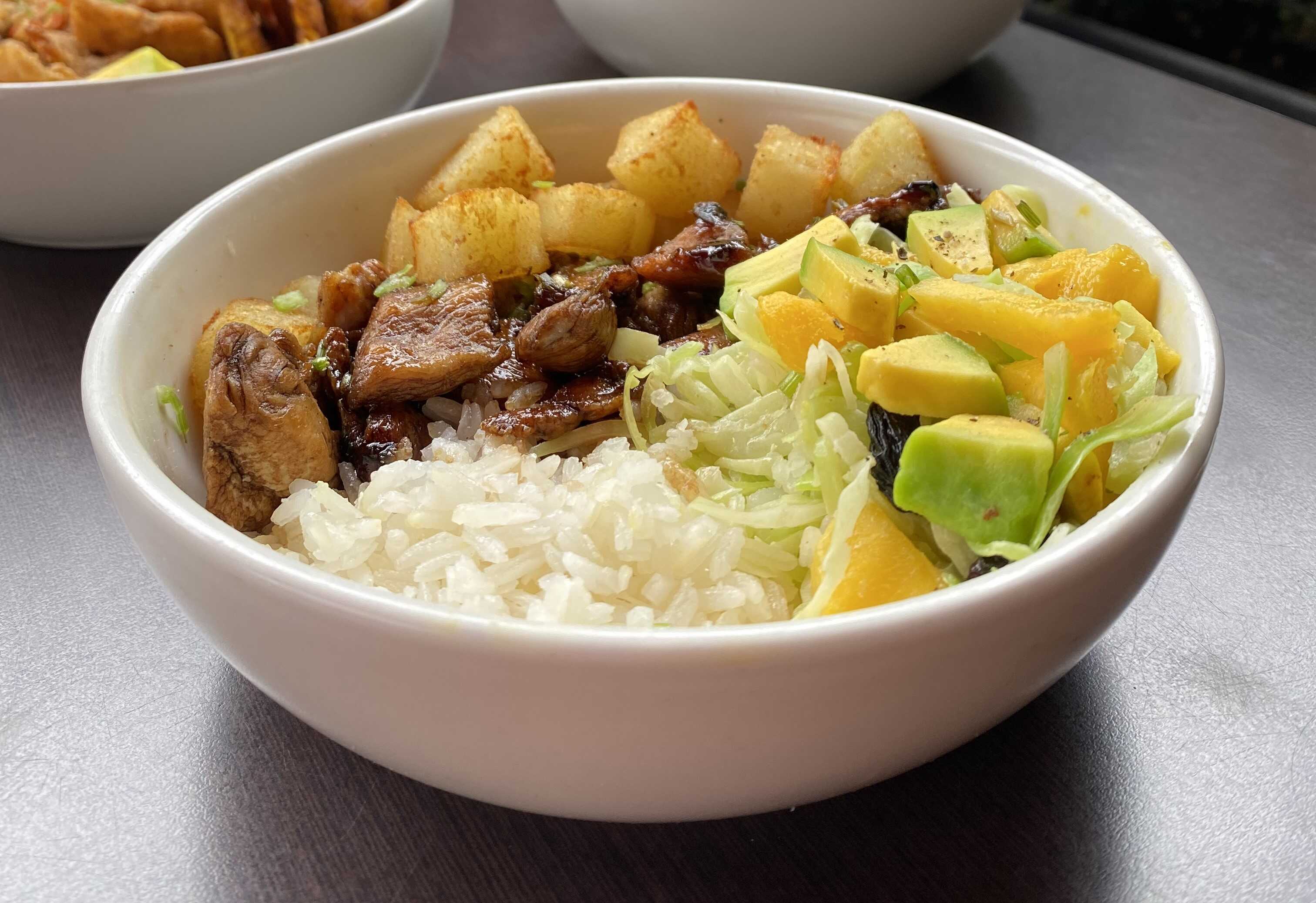 Pollo teriyaki, papa salteada, arroz blanco y ensalada dulce.
