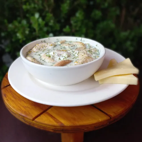 Lomo de res stroganoff en salsa con champiñones acompañado de pan artellano y ensalada.