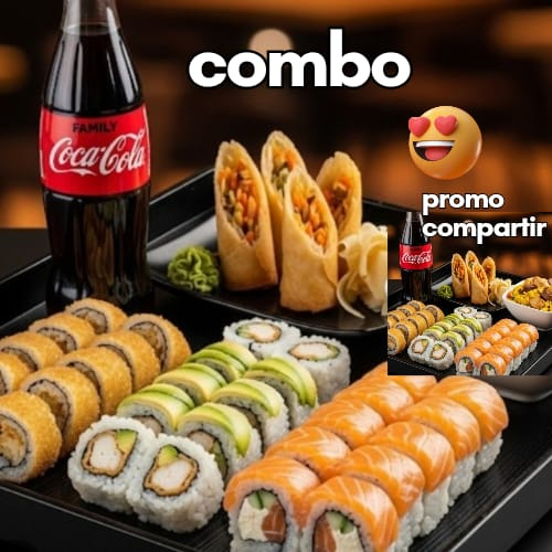 Tuna Roll*1 + Bom Roll*1 + Platin Roll*1 + Salmon Skin*1 + 2 Niguiris*1 + 2 Palmito*1 + Aros de Cebolla Tempura*1 + Banana Crunch*1 + COCA-COLA 1.5 Ml*1 + Postobobon de Litro*1