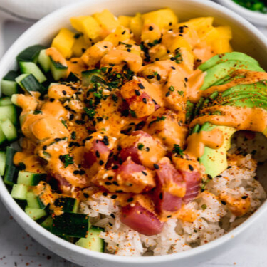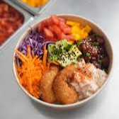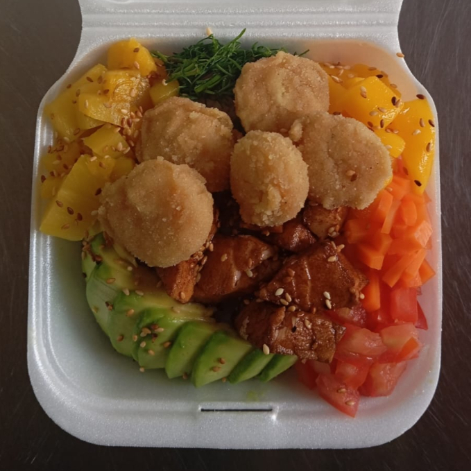 poke: base de arroz, zanahoria, aguacate, mango, piña, tomate, cilantro, camarón apanado, cubos de salmón marinado, topping de ajonjolí