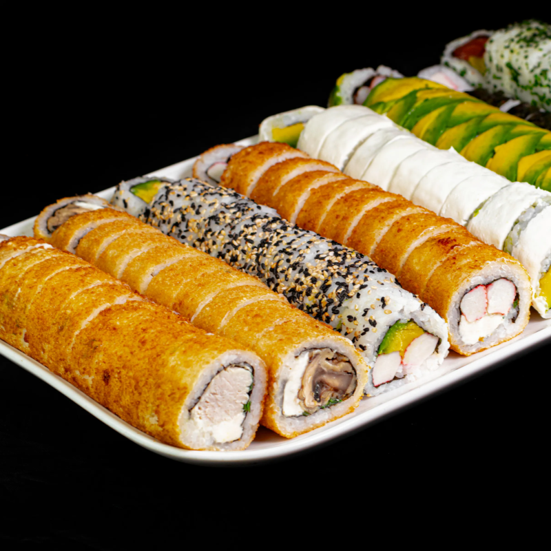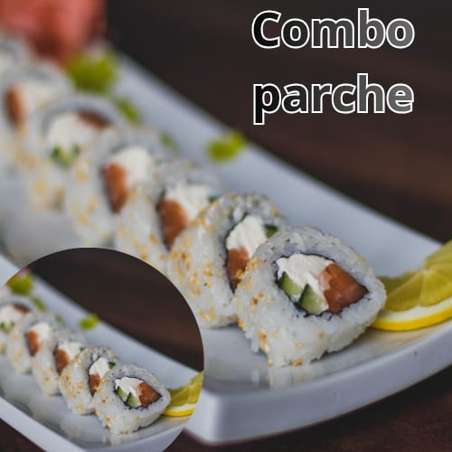 Platin Roll*1 + Salmon Skin*1 + Dinamita Roll*1 + Apanado Roll*1 + California Roll*1 + 2 Niguiris*1 + 2 Palmito*1 + Galletas Apanadas*1 + Postobobon de Litro*1