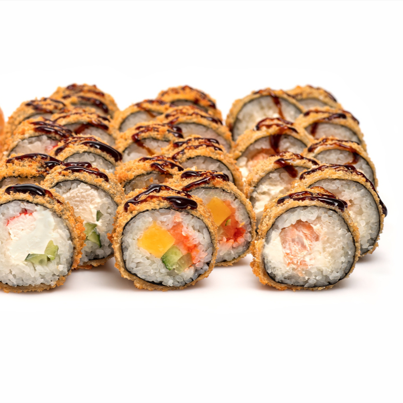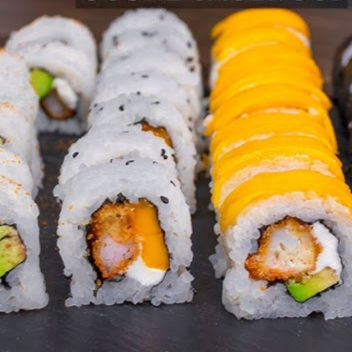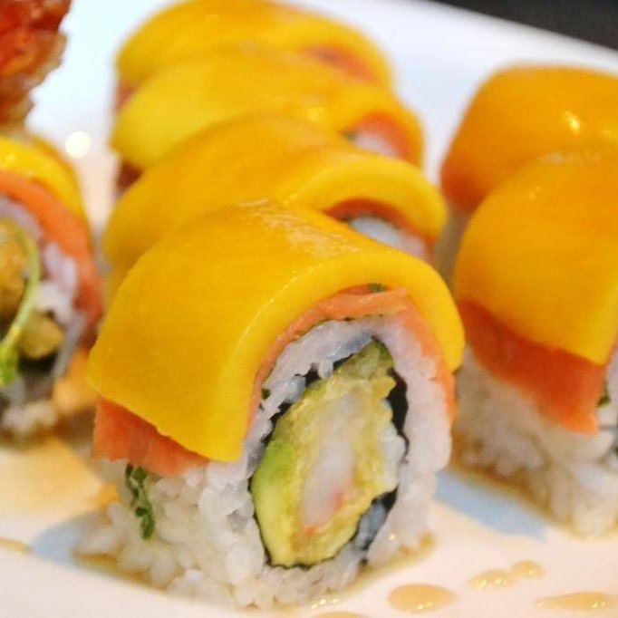 10: bocados de sushi relleno de camarón apanado, aguacate con topping de mango.