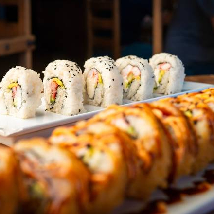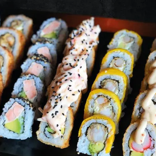 10: bocados de sushi relleno de queso crema, aguacate, atun con topping de ajonjoli.