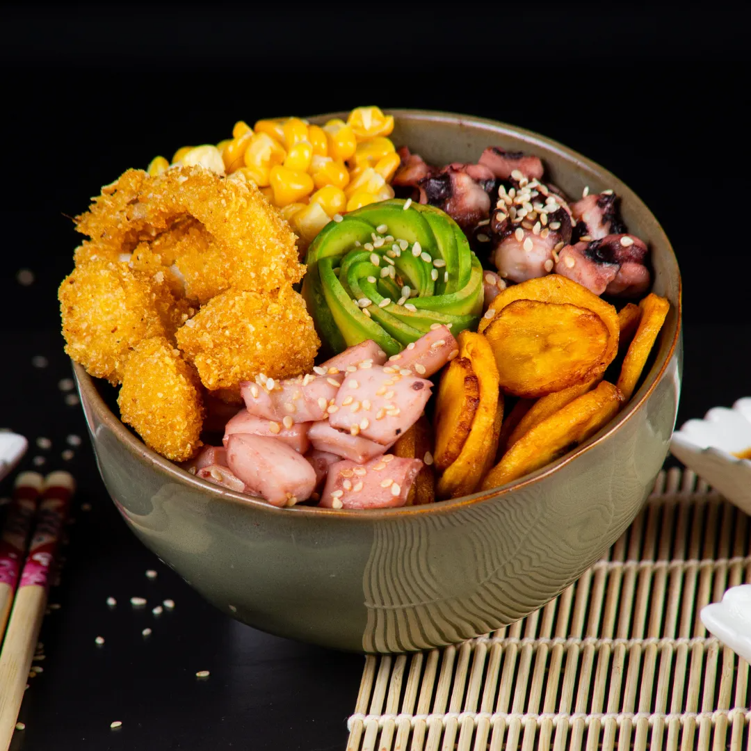 calamar apanado, pulpo guisado, base de arroz, aguacate, algas, tomate, mango, maíz, con topping de ajonjoli . +bebida gratis de 250 ML