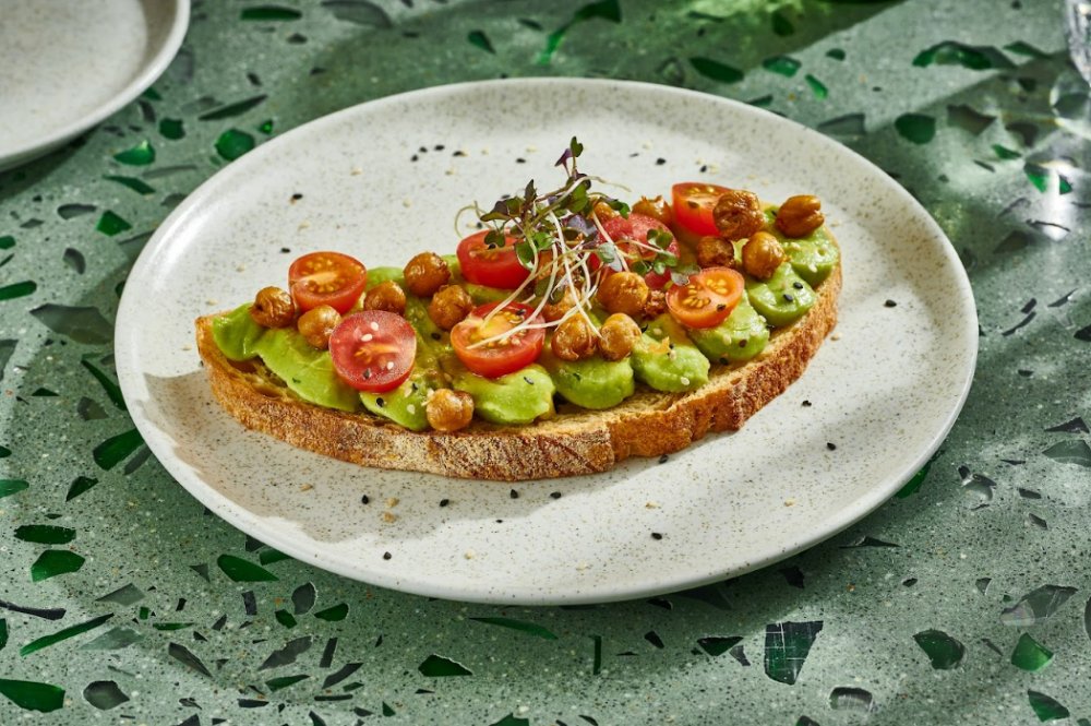 Tostada de pan de masa madre con puré de aguacate, tomates cherry y garbanzos crocantes.