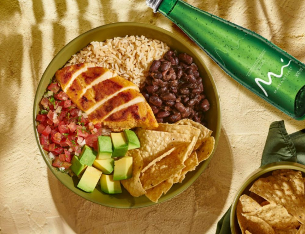 Bowl a base de arroz integral, acompañado de frijol negro, pollo a la plancha, aguacate, pico de gallo y totopos.