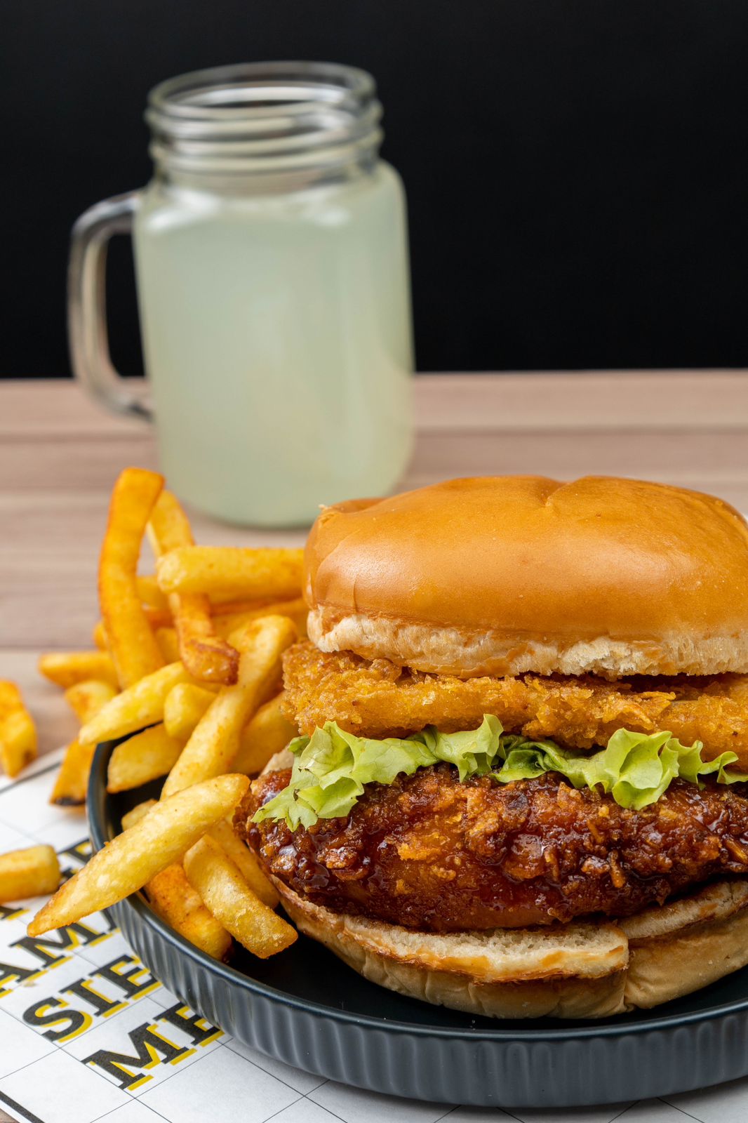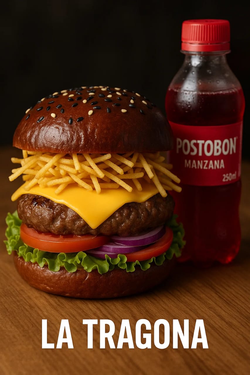 ¡Advertencia! ⚠️ Prohibido comérsela con las manos limpias. carne de res jugosa, , jamón , papa chip ,queso cheddar derretido al exceso, vegetales frescos, una bomba de salsa de la casa y lo mejor: muuuuuucha tocineta crujiente en cada mordisco. Viene con papas francesas doradas y limonada de panela bien fría, pa’ bajar tanta sabrosura.