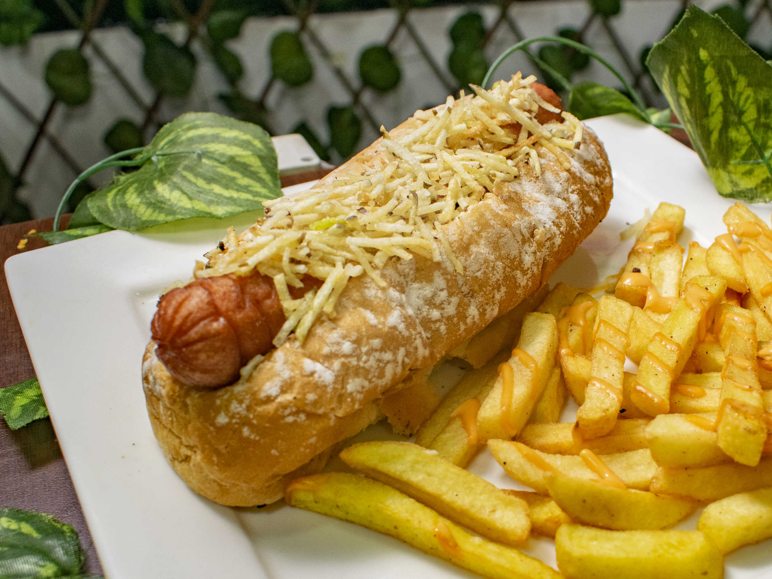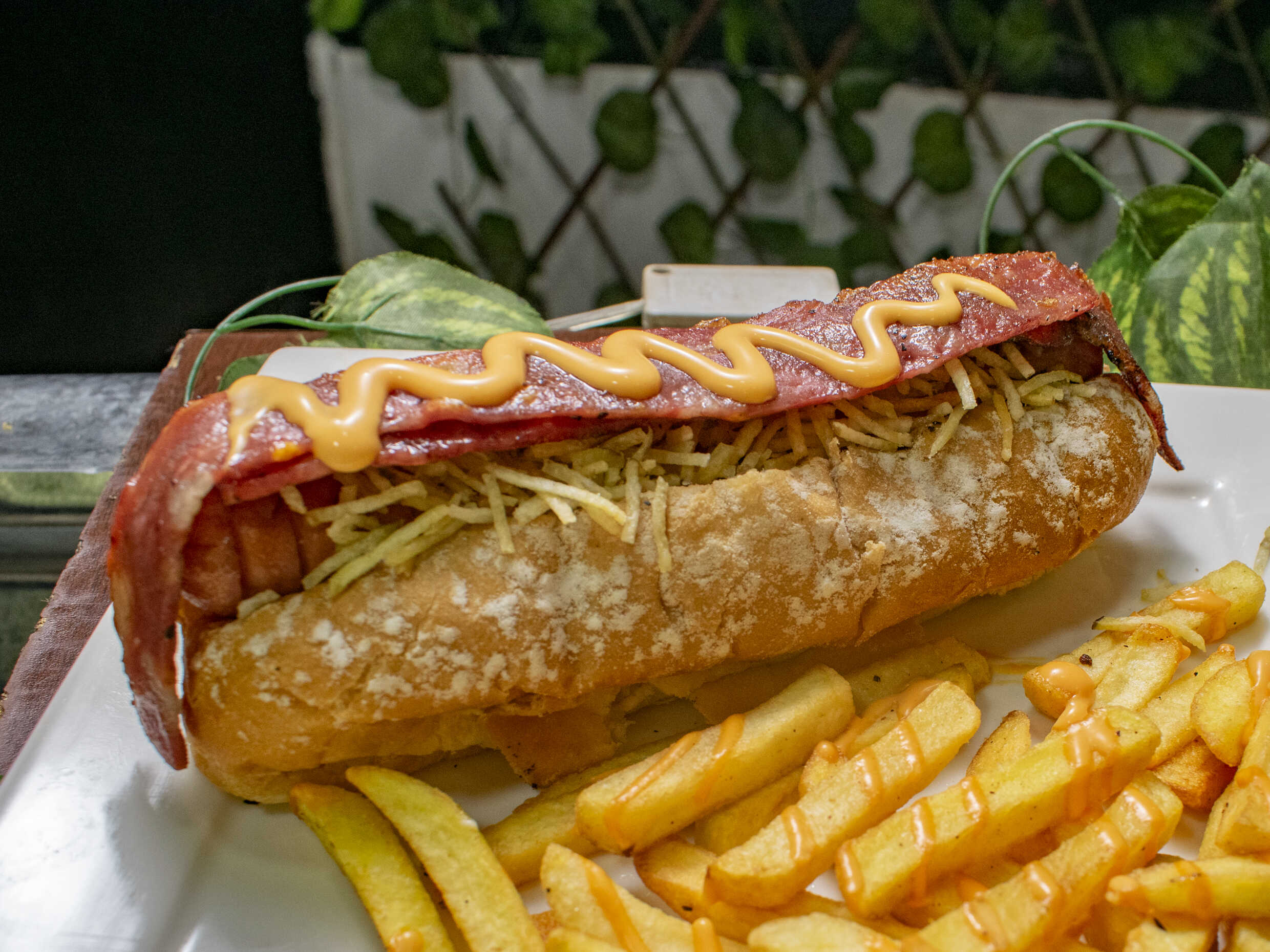 Pan brioche suavecito, salchicha americana jugosa, queso mozzarella fundido, cebolla caramelizada, salsa de la casa con flow secreto y una lluvia de papas chips crocantes pa' rematar como se debe. 💥 Dulce, cremoso y crujiente. Este perro no ladra… ¡muerde duro!
