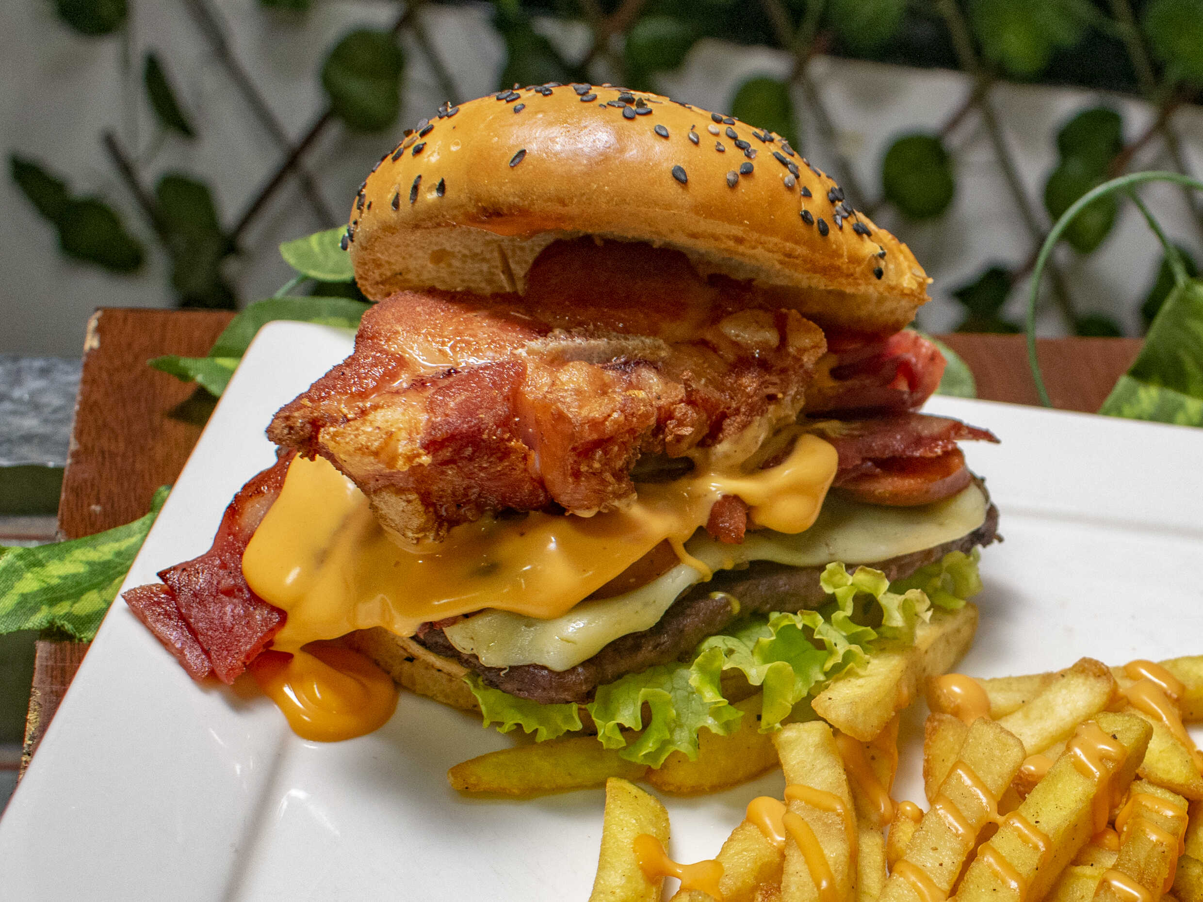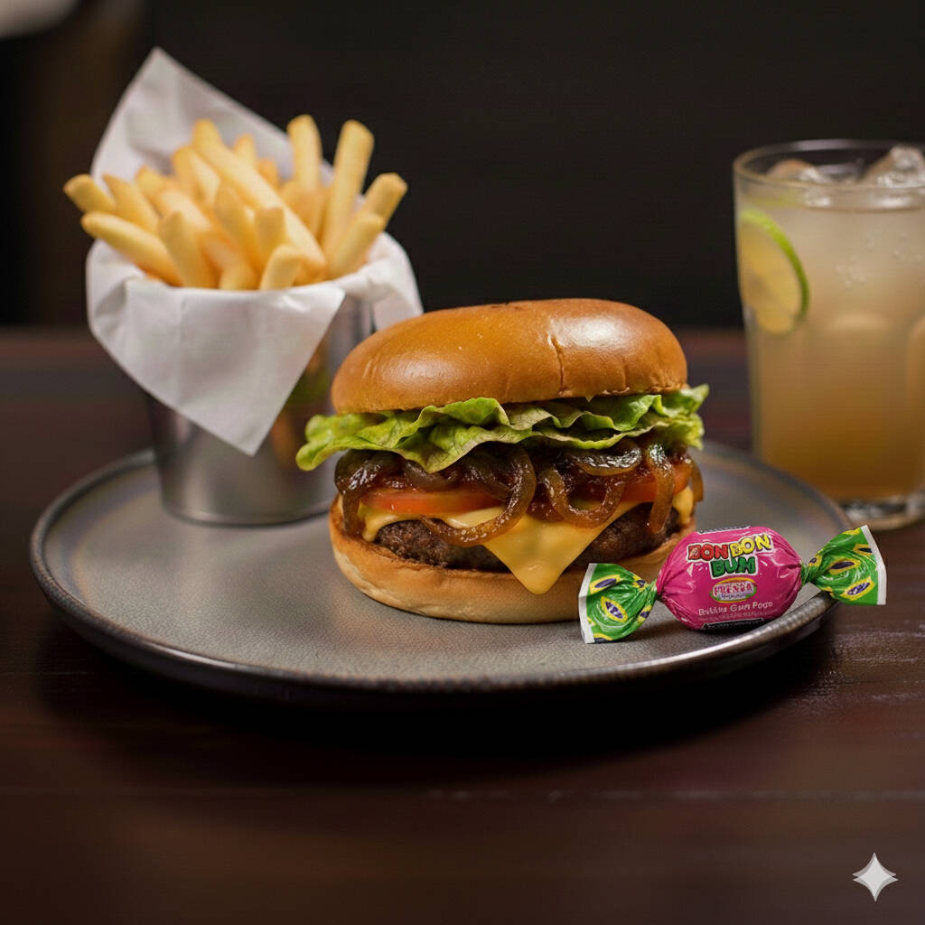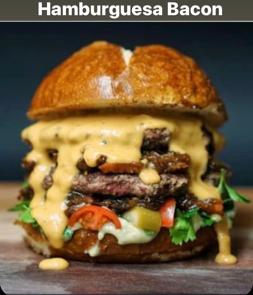 ¡Advertencia! ⚠️ Prohibido comérsela con las manos limpias. carne de res jugosa, , jamón , papa chip ,queso cheddar derretido al exceso, vegetales frescos, una bomba de salsa de la casa y lo mejor: muuuuuucha tocineta crujiente en cada mordisco. Viene con papas francesas doradas y limonada de panela bien fría, pa’ bajar tanta sabrosura.