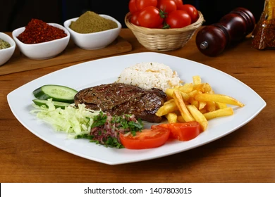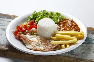 Almuerzo a base de arroz, proteína de elección, papas a la francesa y ensalada.
