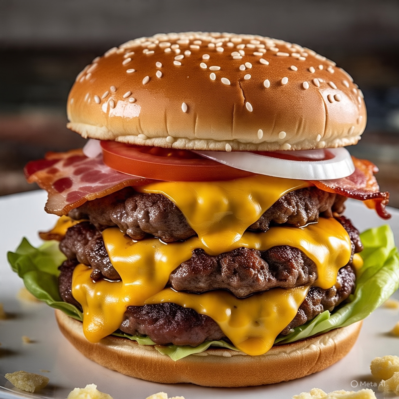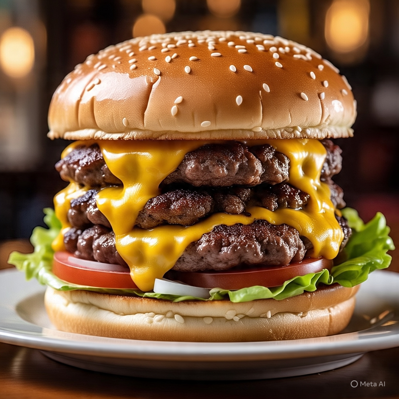 Pan de ajonjolí, triple queso cheddar, triple carne de res de 120 g, lechuga, tomate, cebolla y salsas de la casa.
