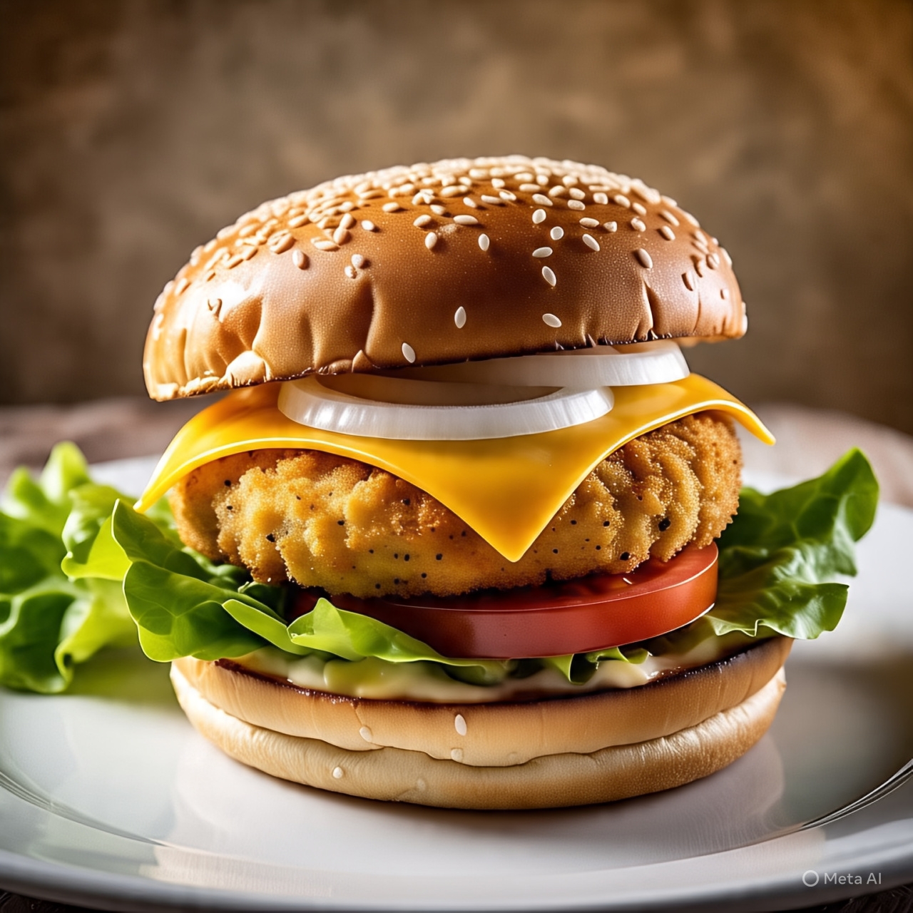 Pan de ajonjolí, queso cheddar, pollo apanado, lechuga, tomate, cebolla y salsas de la casa.