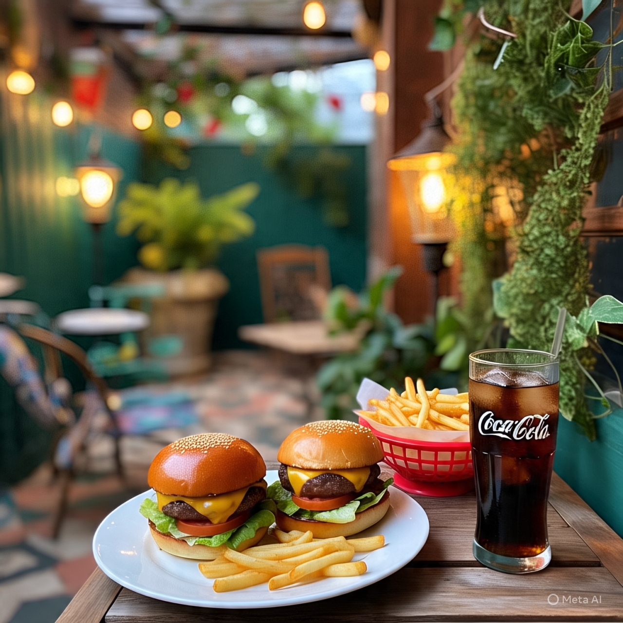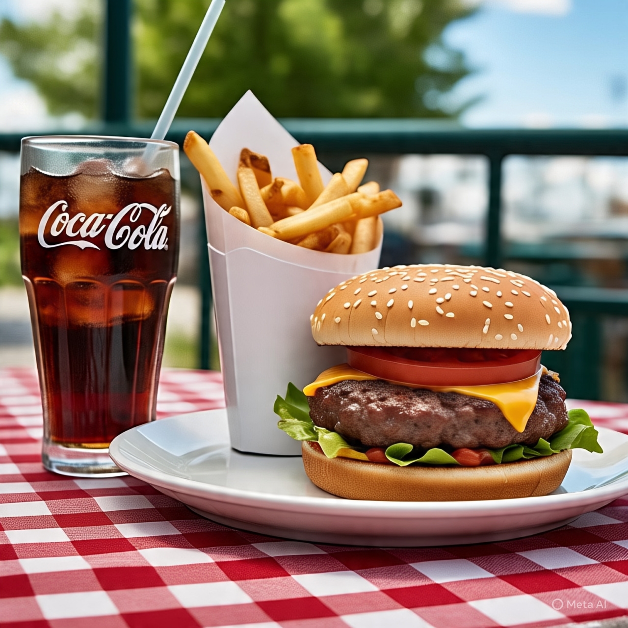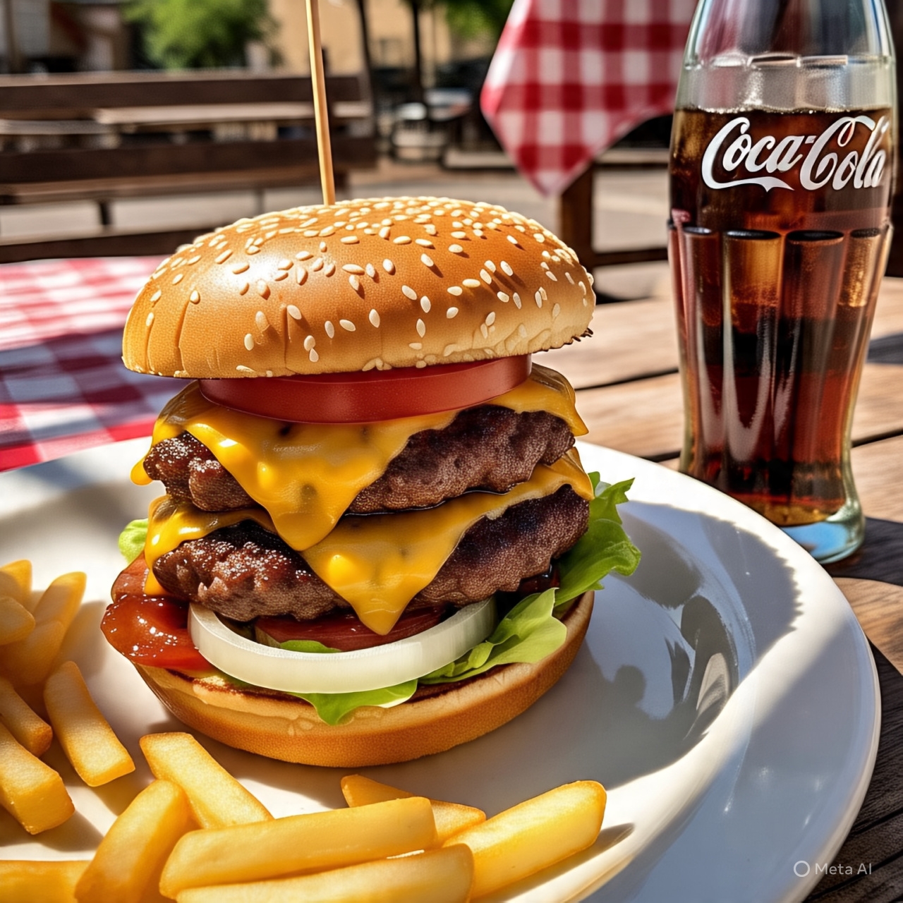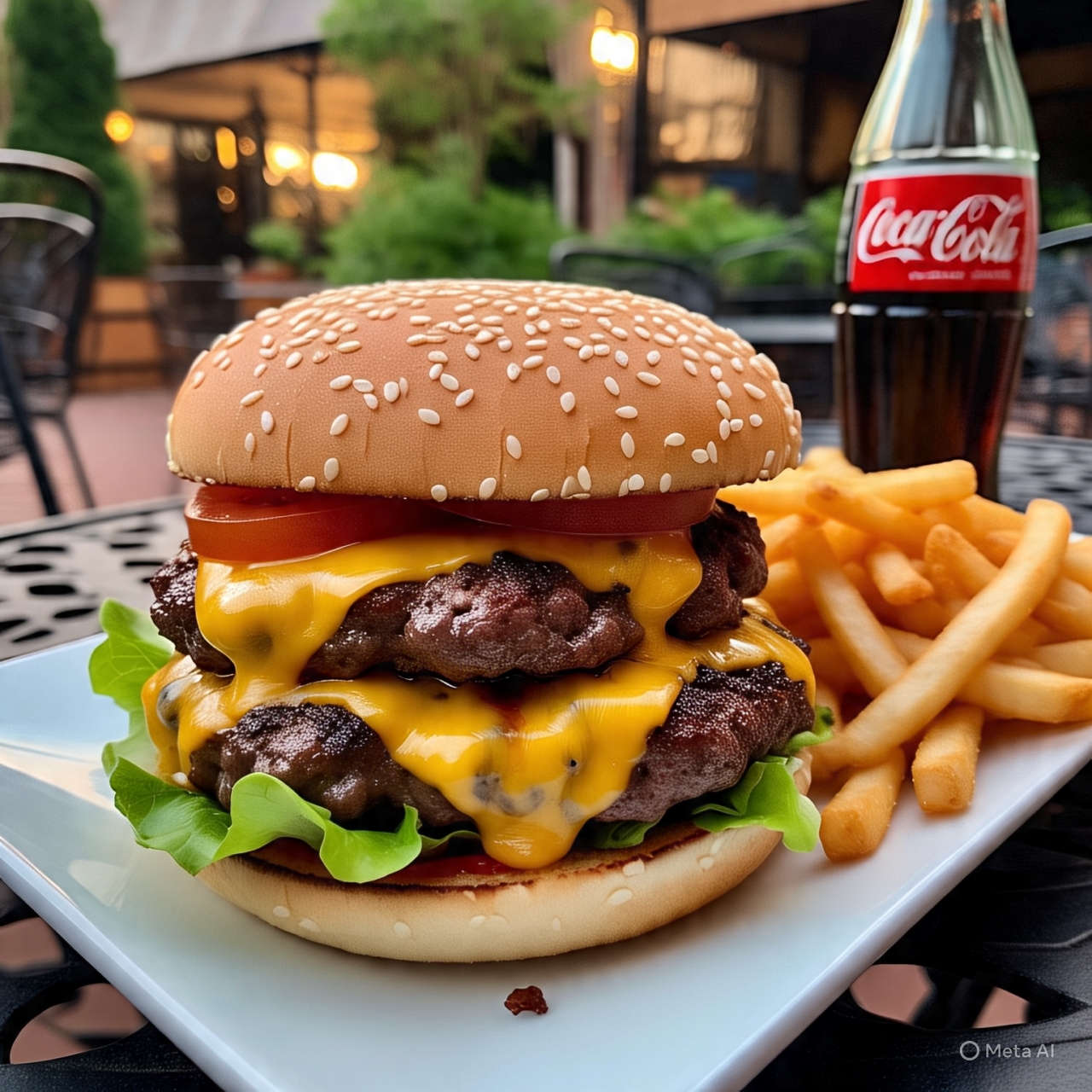 Pan de ajonjolí, carne de res de 120 g, queso cheddar, lechuga, tomate, cebolla, salsas de la casa, coca cola 250 ml y francesas.