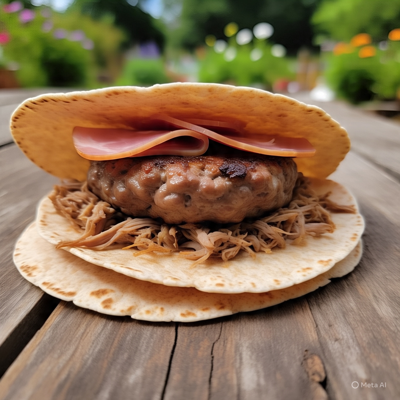 Tortilla Bimbo, carne de res de 120 g, queso cheddar, carne desmechada, jamón, lechuga, tomate, cebolla y salsas de la casa.