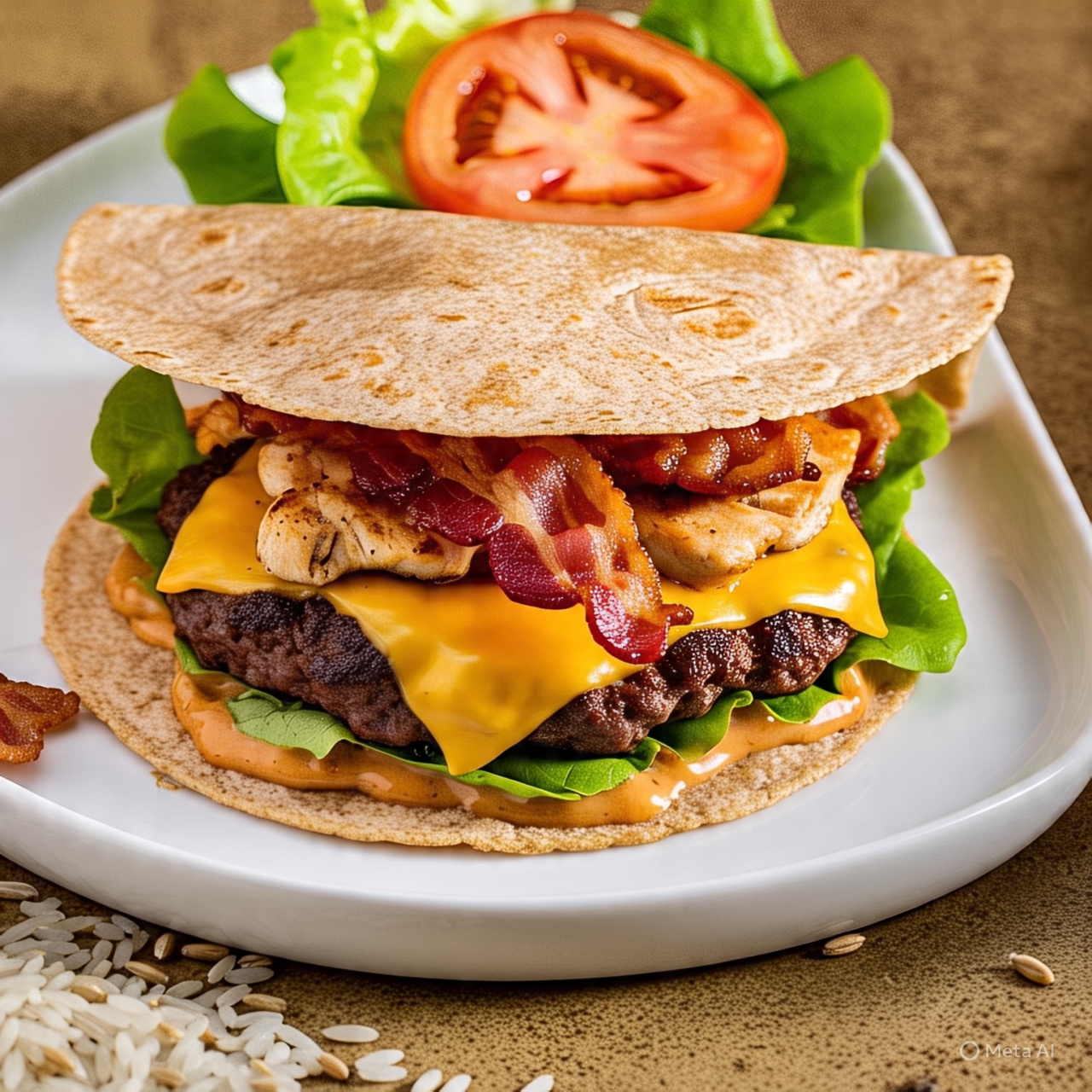 Tortilla Bimbo, carne de res de 120 g, pollo apanado, queso cheddar, lechuga, tomate, cebolla y salsas de la casa.