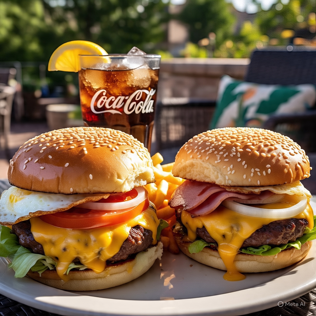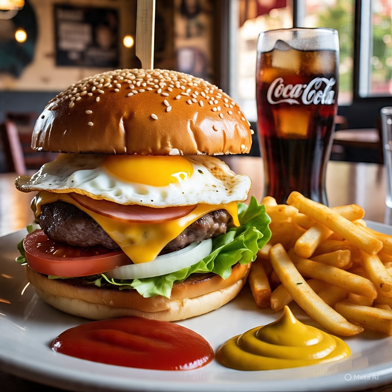 Pan de ajonjolí, carne de res de 120 g, queso cheddar, huevo frito, jamón, lechuga, tomate, cebolla, salsas de la casa, coca cola 250 ml y francesas.