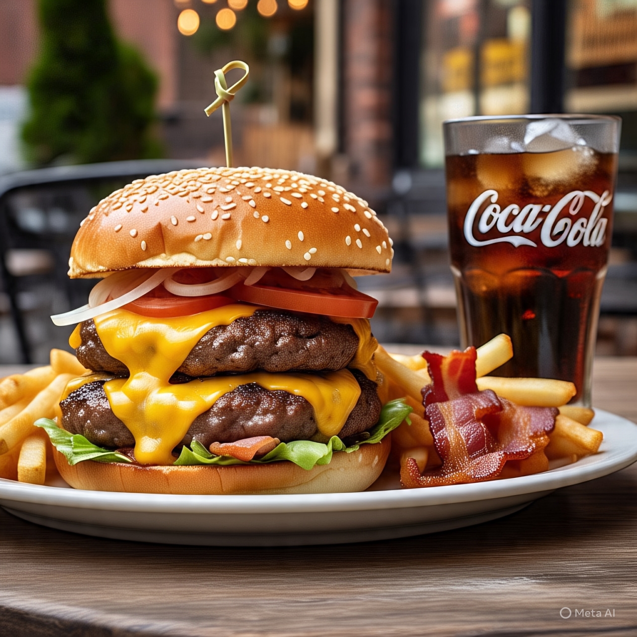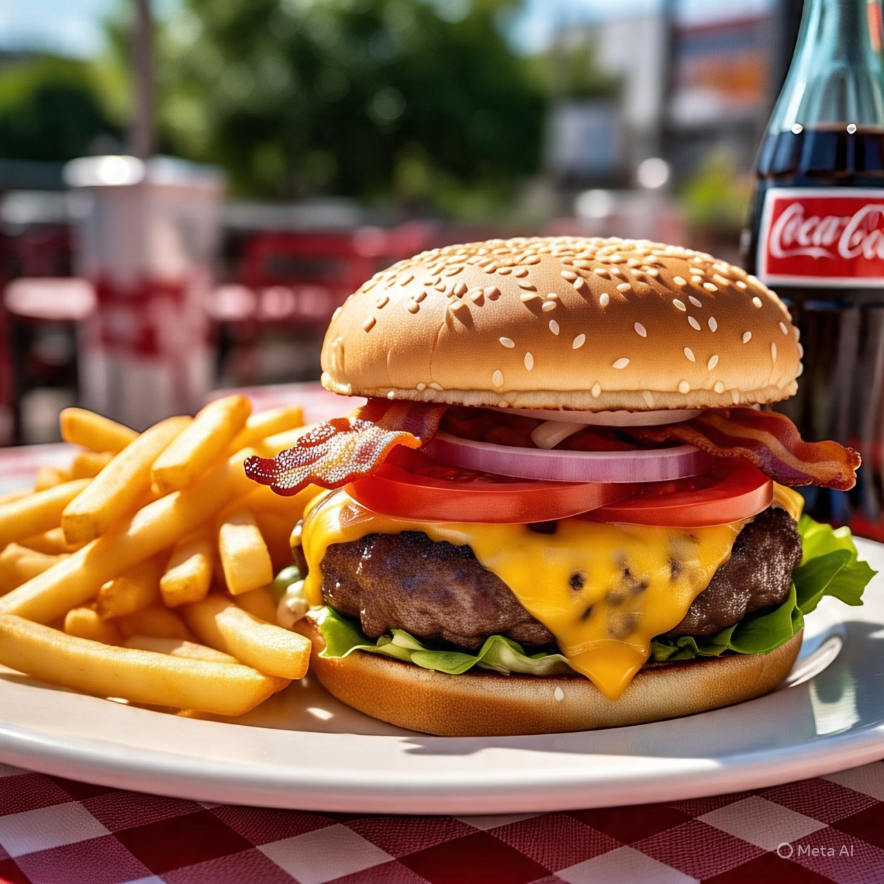 Pan de ajonjolí, carne de res de 120 g, queso cheddar, tocineta, lechuga, tomate, cebolla, salsas de la casa, coca cola 250 ml y francesas.