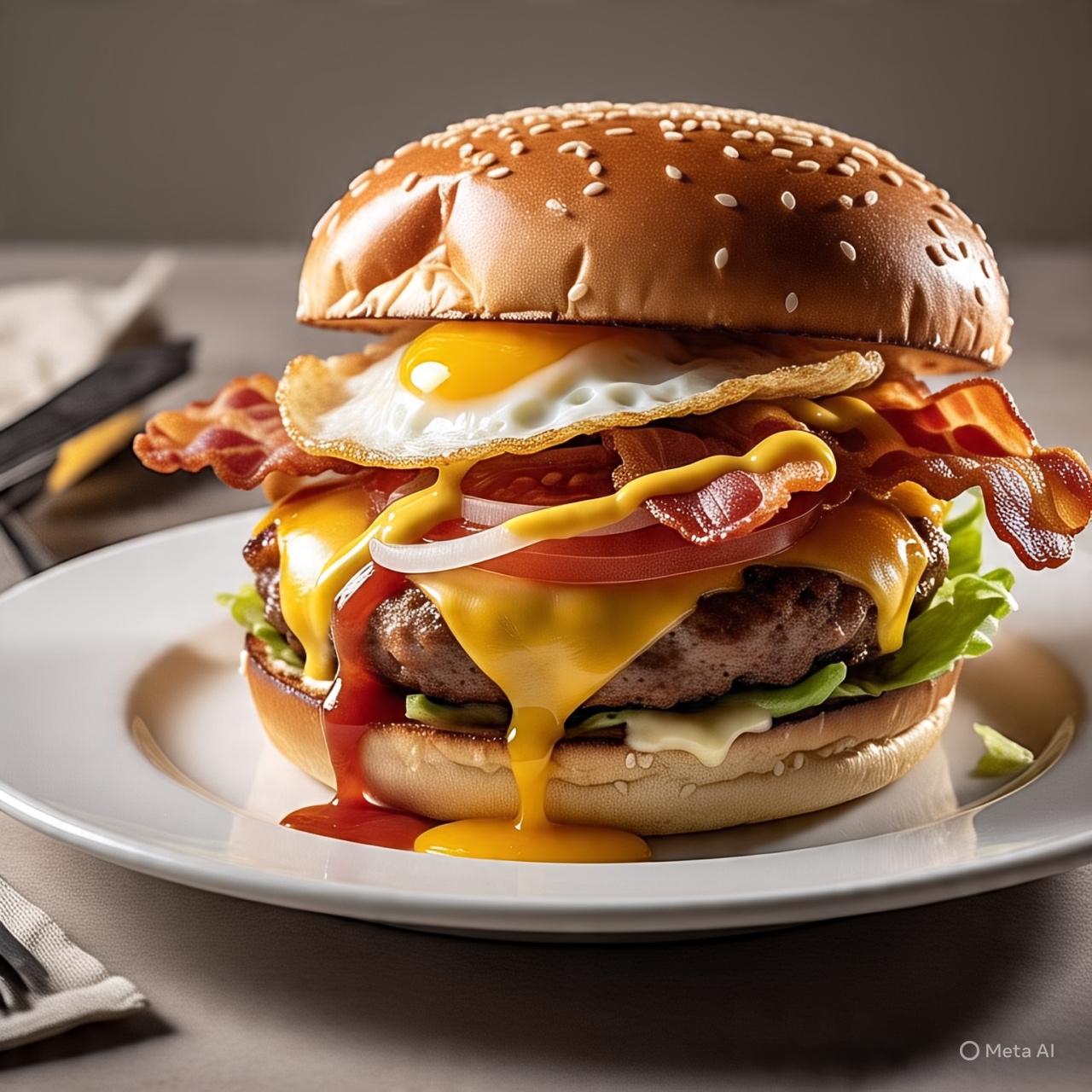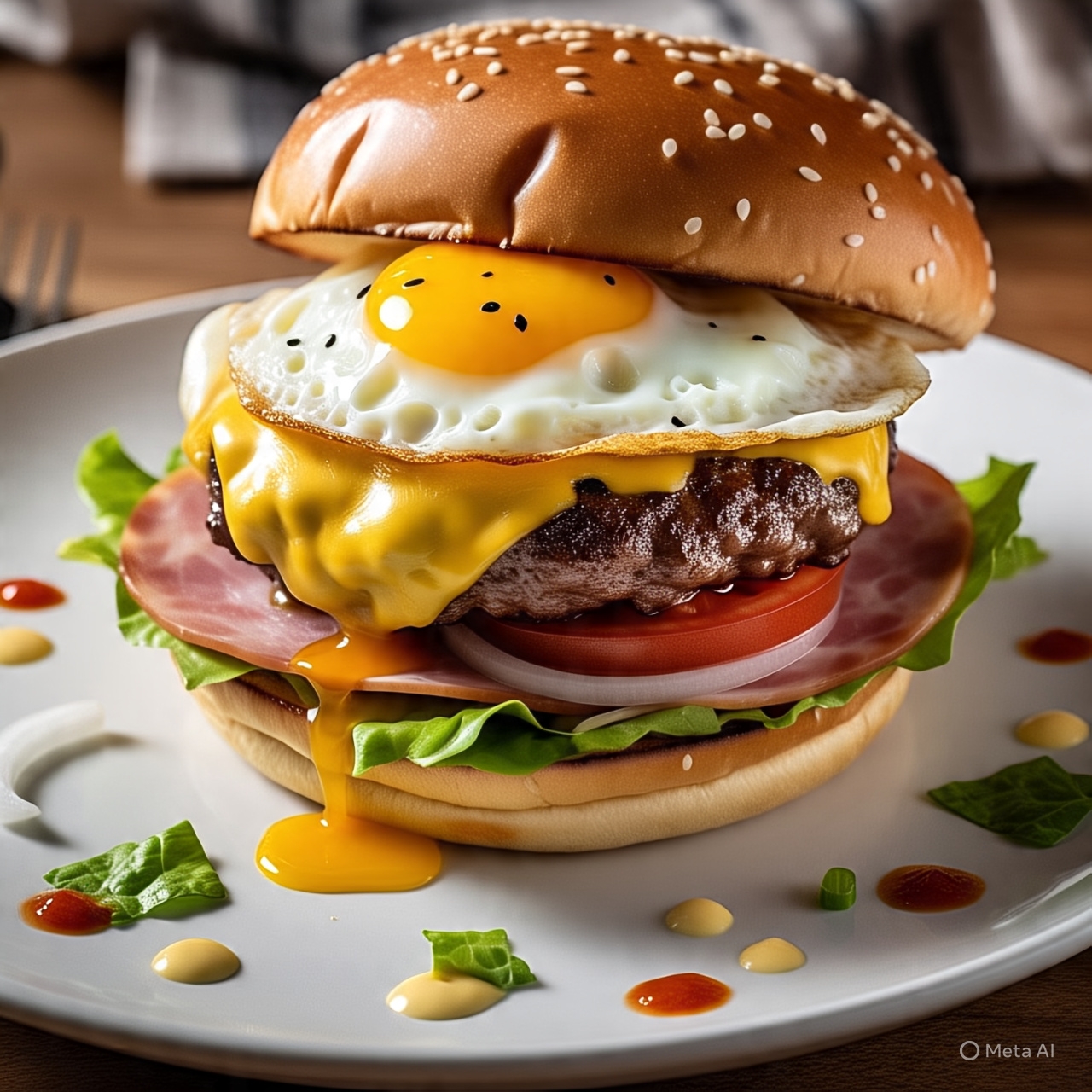 Pan de ajonjolí, queso cheddar, carne de res de 120 g, huevo frito, jamón, lechuga, tomate, cebolla y salsas de la casa.