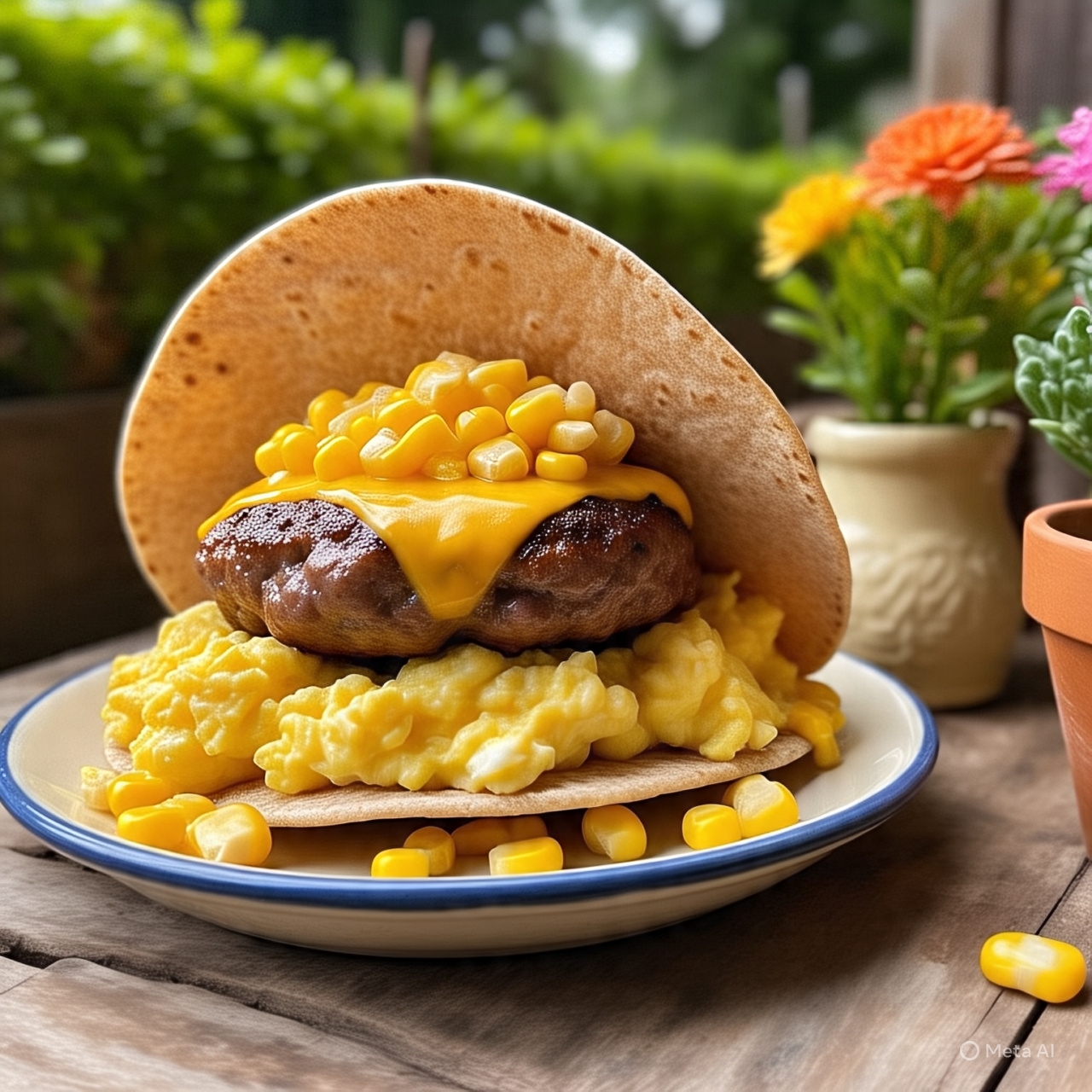 Tortilla Bimbo, carne de res de 120 g, queso cheddar, huevo revuelto con maíz tierno, lechuga, tomate, cebolla y salsas de la casa.