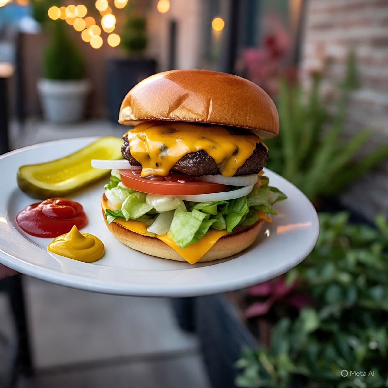 Pan de ajonjolí, queso cheddar, carne de res de 120 g, lechuga, tomate, cebolla y salsas de la casa.