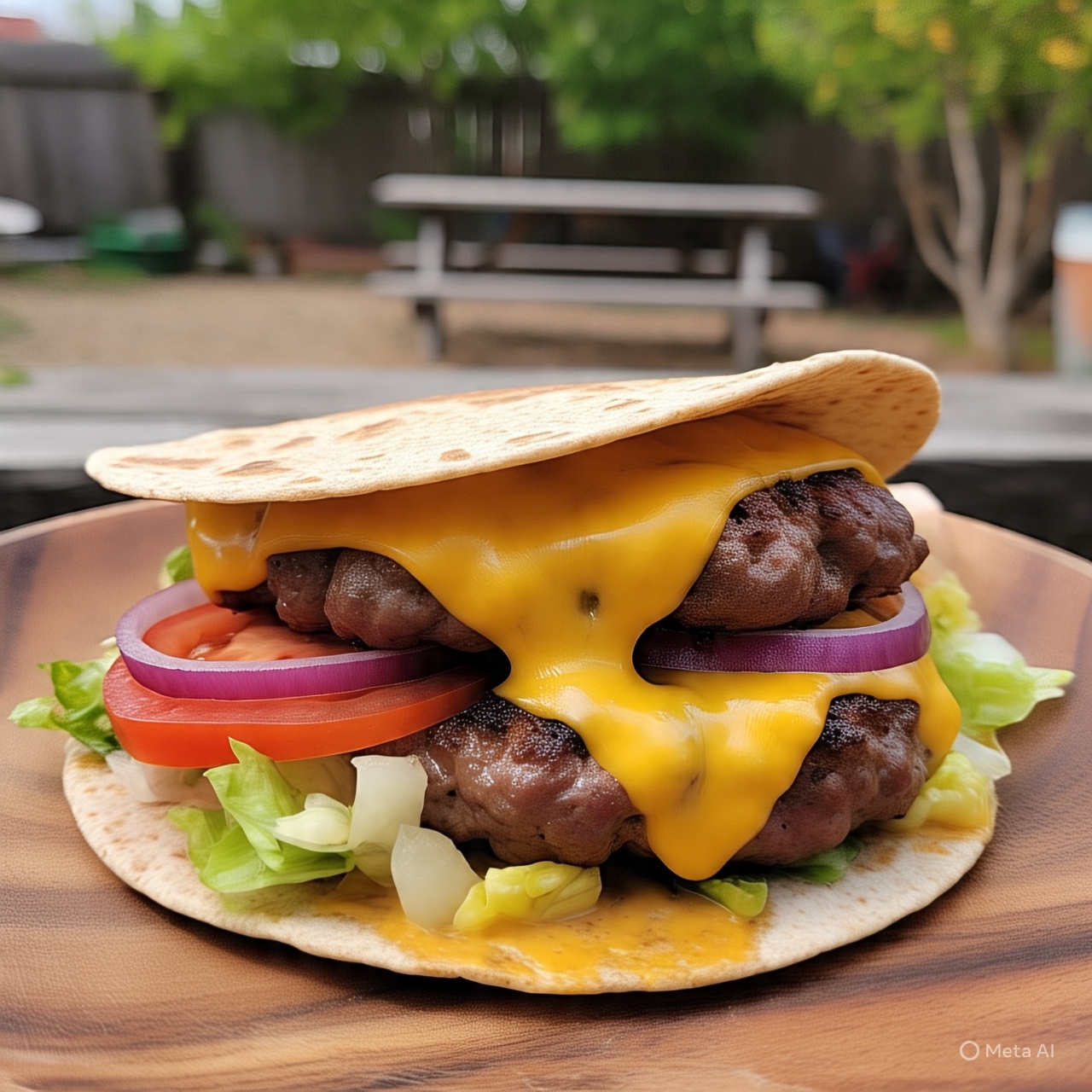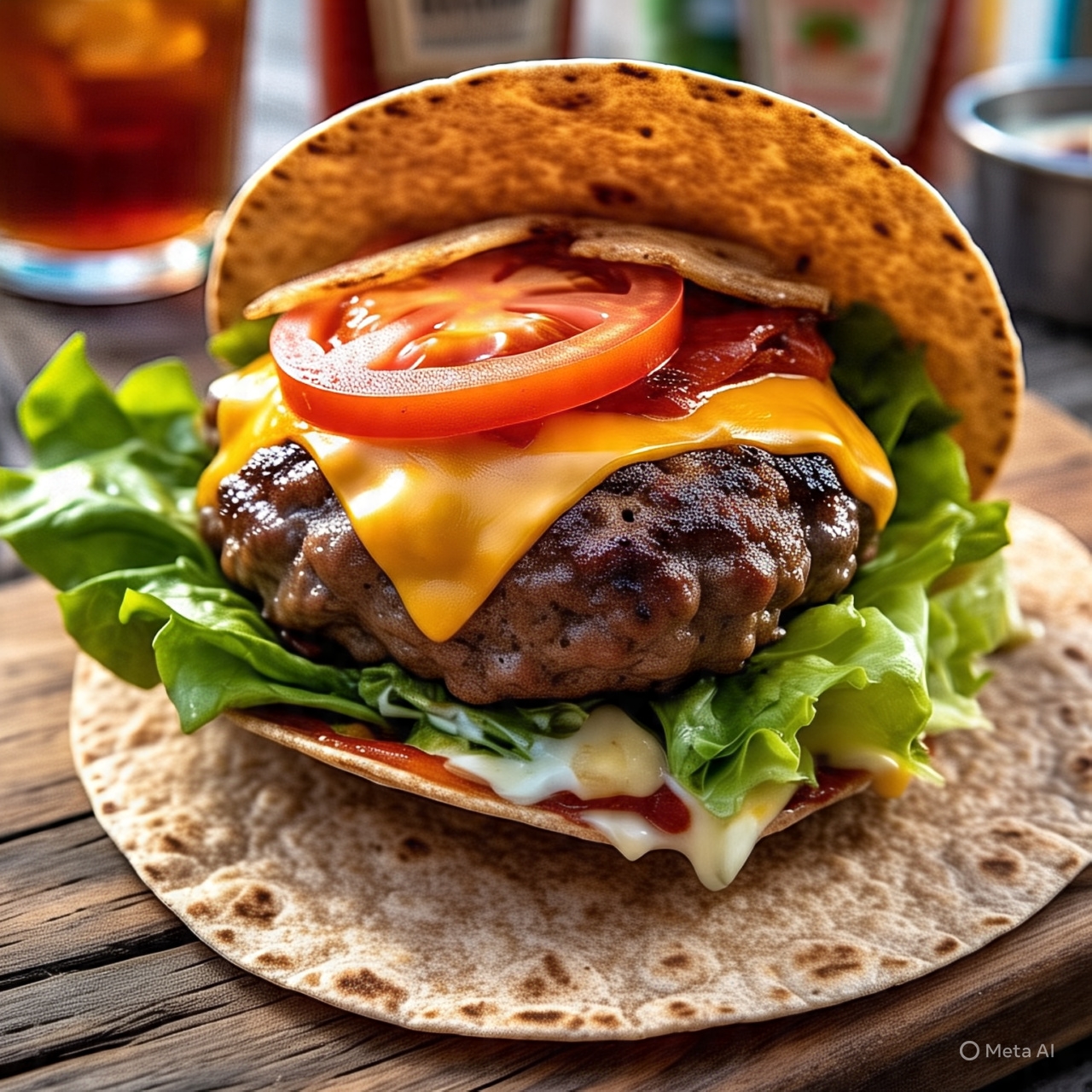 Tortilla Bimbo, triple carne de res de 120 g, queso cheddar, lechuga, tomate, cebolla y salsas de la casa.