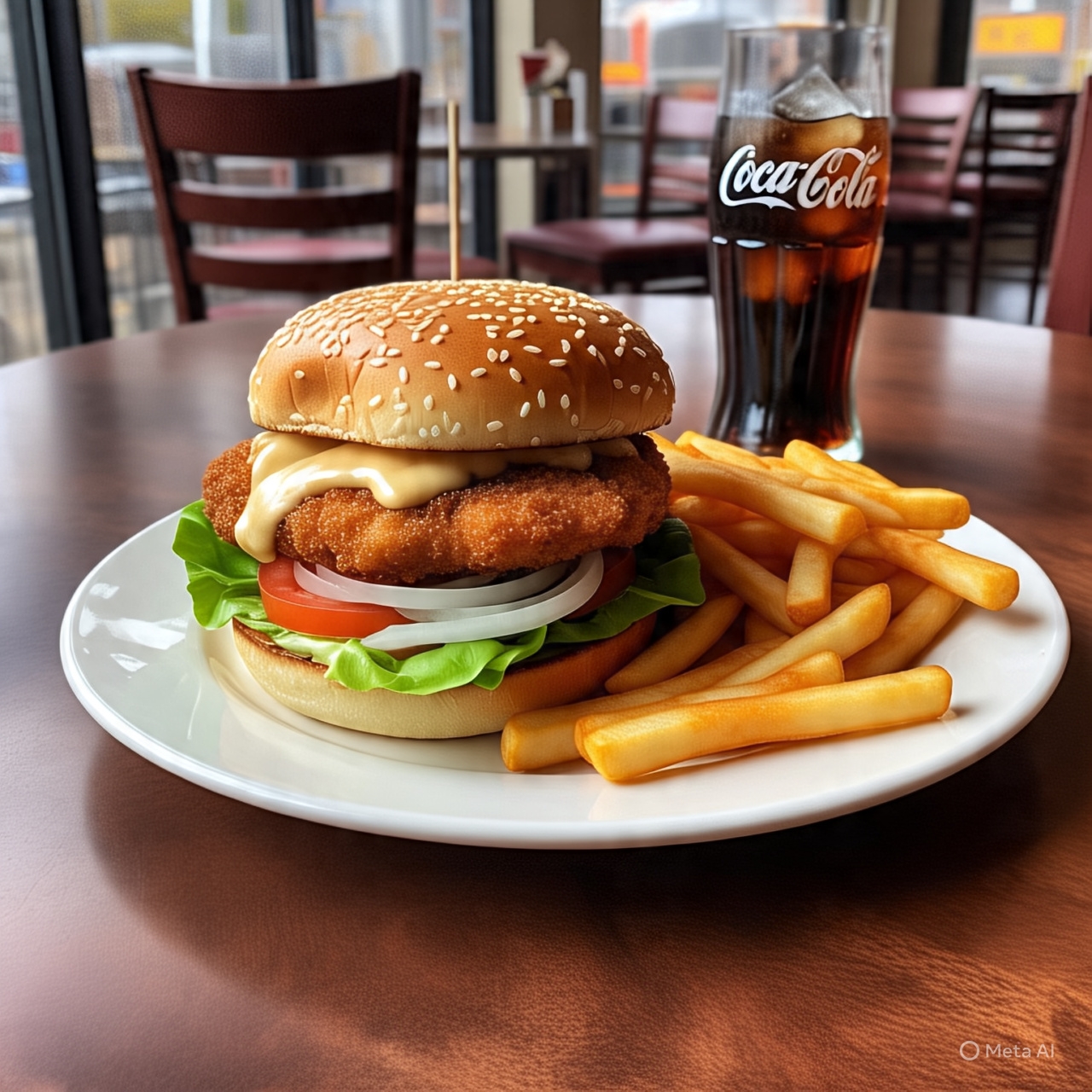 Pan de ajonjolí, pollo apanado, queso cheddar, lechuga, tomate, cebolla, salsas de la casa, coca cola 250 ml y francesas.