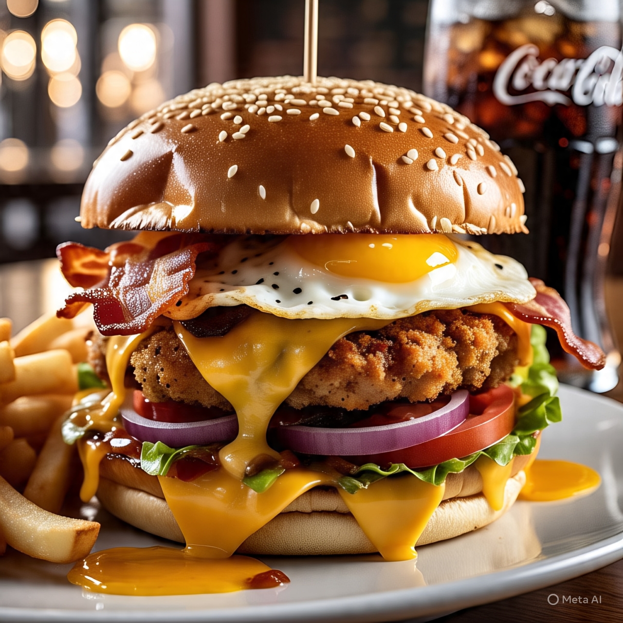 Pan de ajonjolí, carne de res de 120 g, queso cheddar, pollo apanado, huevo frito, tocineta, jamón, lechuga, tomate, cebolla, salsas de la casa, coca cola 250 ml y francesas.