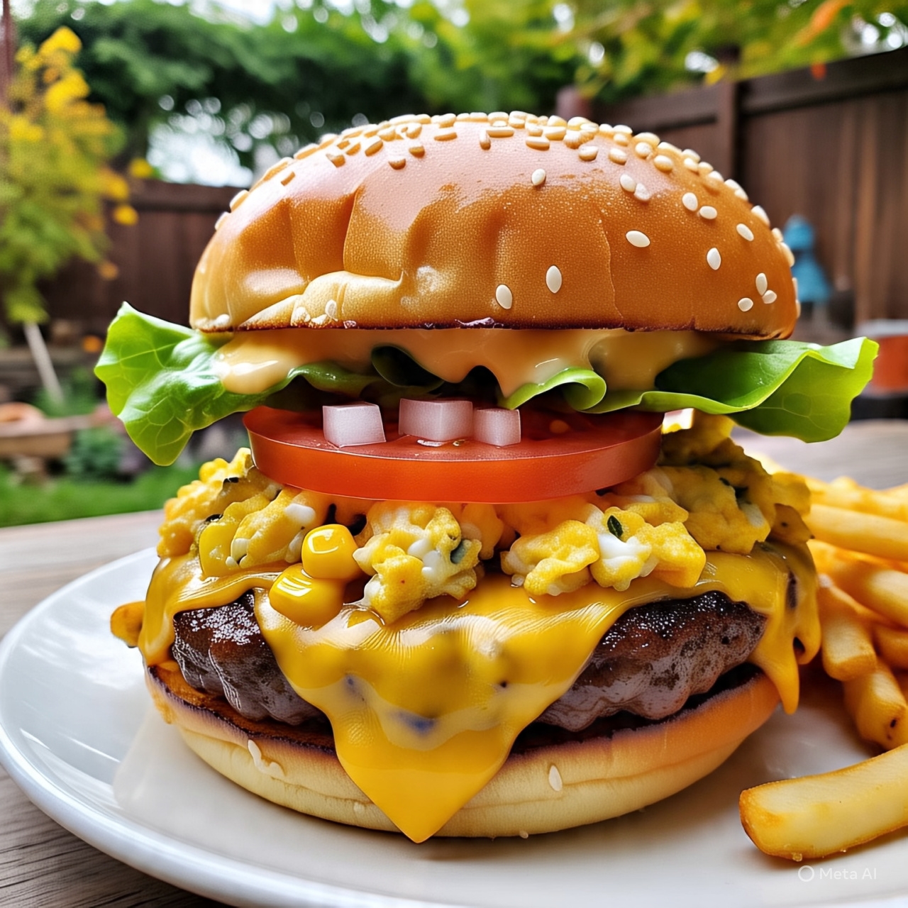 Pan de ajonjolí, queso cheddar, carne de res de 120 g, huevo revuelto con maíz tierno, lechuga, tomate, cebolla y salsas de la casa.